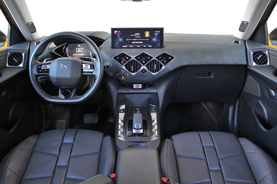 Η πολυτέλεια και το μοναδικό στιλ είναι διάχυτα και στο θάλαμο των επιβατών του DS 3 Crossback. Σε συνδυασμό και με τα άριστης ποιότητας υλικά που έχουν χρησιμοποιηθεί, την προσεγμένη συναρμογή και το ανωτέρου επιπέδου φινίρισμα, ενισχύεται περεταίρω η premium αίσθηση που απολαμβάνουν οι επιβάτες. Το ταμπλό και οι πόρτες καλύπτονται από μαλακά πλαστικά, ύφασμα ή δέρμα Nappa και Alcantara υψηλής ποιότητας (πρόσθετος εξοπλισμός), ραφές σε σχήμα μαργαριταριού και ανάγλυφα διακοσμητικά. Το σχήμα του διαμαντιού κυριαρχεί από τα γραφικά των οθονών, έως τα διάφορα επιμέρους χειριστήρια, τα οποία αντικατοπτρίζουν το έμβλημα της μάρκας.