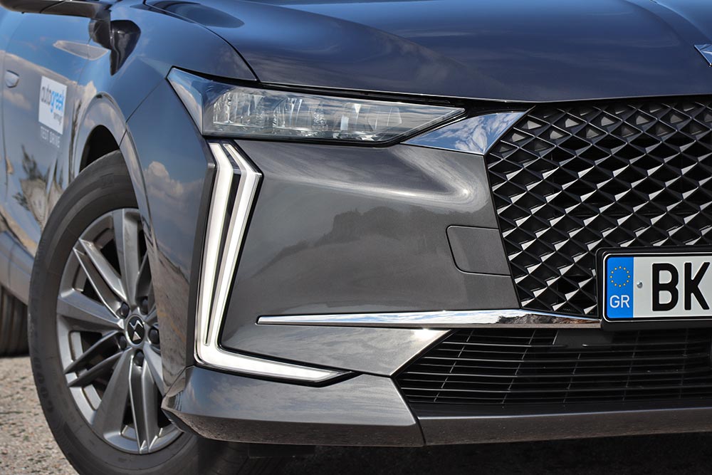 Το πρώτο στοιχείο που τραβά το ενδιαφέρον στο νέο DS 4, δεν είναι άλλο από τον ανάγλυφο σχεδιασμό του. Ολόκληρο το αμάξωμα των 4,4 μ. μήκους, φέρει αιχμηρά στοιχεία, έντονα νεύρα και γλυπτές επιφάνειες. Μπροστά τραβούν τα βλέμματα τα κάθετα φώτα LED σχήματος «L», οι πολύ λεπτοί προβολείς και η μεγάλη τρισδιάστατη μάσκα με το μοτίβο σε σχήμα διαμαντιού. Στο πλάι διακρίνονται τα διαδοχικά νεύρα, η έντονη γωνία που σχηματίζεται στις πίσω κολόνες με το μαύρο φινίρισμα και το σήμα της DS, καθώς και οι πτυσσόμενες χειρολαβές των θυρών. Αυτές αναδύονται αυτόματα όταν πατηθεί ο διακόπτης από το τηλεχειριστήριο για να ανοίξουν οι πόρτες και κλείνουν εν κινήσει. Ωστόσο, όταν είναι κλειστές και προσπαθήσει ο επιβάτης να τις ανοίξει χειροκίνητα, τότε θα δυσκολευτεί. Οι γωνίες και ακμές συνεχίζονται και στο πίσω άκρο του DS 4, όπου κυριαρχούν τα λεπτά LED φωτιστικά σώματα. Η αλήθεια είναι ότι στο γκρι εικονιζόμενο χρώμα και με τις 17άρες ζάντες με ελαστικά 215/65 που φόραγε η έκδοση Bastille+ του τεστ, το αμάξωμα χάνει κάποιους «πόντους» σε εμφάνιση, αφού σε λευκό και με 19άρες ζάντες (205/55 λάστιχα) τονίζονται οι λεπτομέρειες και δείχνει σαφώς πιο εντυπωσιακό.