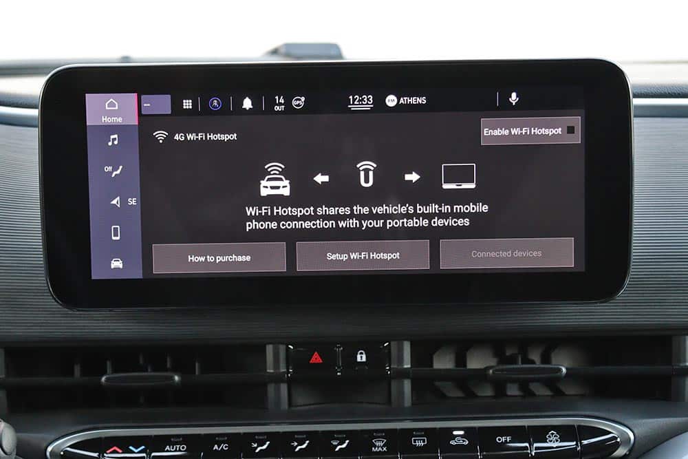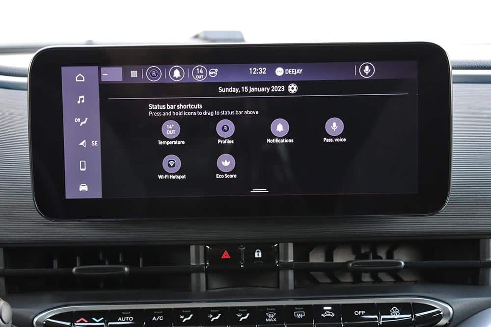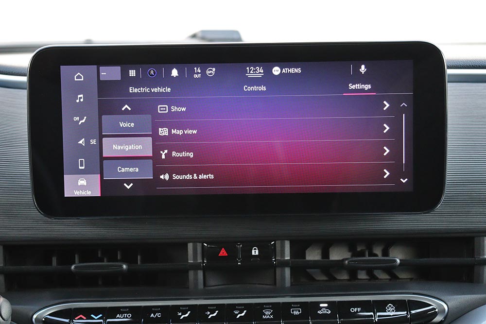 Ο οδηγός κάθεται αναπαυτικά στο κάθισμα και θα βρει εύκολα την κατάλληλη θέση χάρη και στη δυνατότητα ρύθμισης του τιμονιού σε ύψος και απόσταση, ενώ θήκες για μικροαντικείμενα υπάρχουν αρκετές. Στο κέντρο χαμηλά του ταμπλό είναι τοποθετημένα τα τέσσερα πλήκτρα για την επιλογή της μετάδοσης κίνησης (P, R, N, D). Πιο πίσω και ανάμεσα από τα εμπρός καθίσματα υπάρχει η κονσόλα με αποθηκευτικό χώρο, πτυσσόμενη ποτηροθήκη, ο διακόπτης του ηλεκτρικού χειρόφρενου και τα χειριστήρια για την ένταση του ήχου και την επιλογή των οδηγικών προφίλ του e-Mode (Normal, Range και Sherpa). Σε επίπεδο κατασκευής, τα σκληρά πλαστικά που έχουν χρησιμοποιηθεί διαθέτουν στιβαρή συναρμογή και ικανοποιούν με την υφή τους.