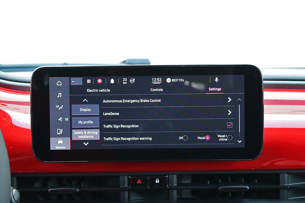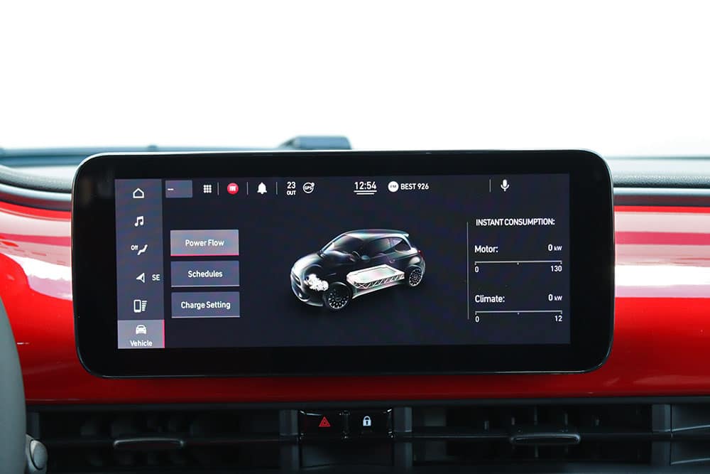 Στην κεντρική κονσόλα, βρίσκουμε τα 4 κουμπιά επιλογής για τη μετάδοση της κίνησης (P, R, N, D). Ο διακόπτης του ηλεκτρικού χειρόφρενου, το περιστροφικό χειριστήριο για την ένταση του ήχου και την επιλογή των 3 οδηγικών προφίλ του e-Mode (Normal, Range και Sherpa), είναι εργονομικά τοποθετημένα στο δεξί μας χέρι. Το πρόγραμμα Normal προσφέρει τη μέγιστη δυνατή επιτάχυνση, το Range ενεργοποιείται η λειτουργία «one-pedal-drive», φρενάροντας έντονα στο άφημα του γκαζιού, ενώ το Sherpa χρησιμοποιείται όταν η διαθέσιμη ενέργεια είναι σε πολύ χαμηλά επίπεδα για τη μέγιστη οικονομία ρεύματος. Πίσω από το τιμόνι υπάρχουν επίσης χειριστήρια διαχείρισης του ηχοσυστήματος, για άμεση πρόσβαση. Ο χώρος αποσκευών ανέρχεται στα 185 λίτρα.