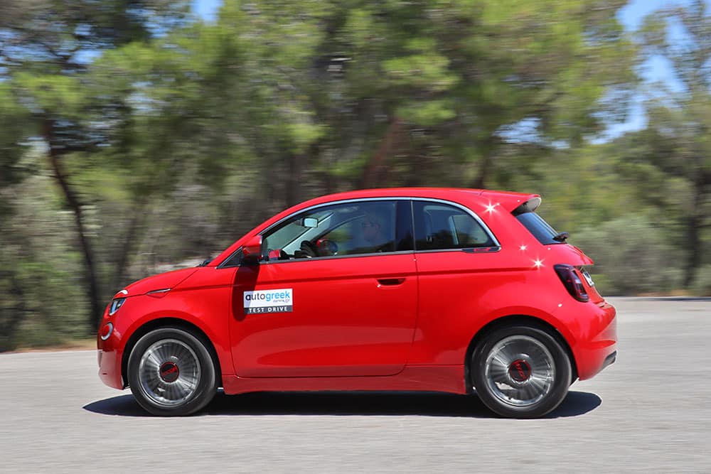 Η έκπληξη όλων στο δρόμο και η πολύ συχνή ερώτηση, αν είναι ηλεκτρικό, όντας αθόρυβο, μας γεμίζει πάντα με ένα κρυφό χαμόγελο. Το μοντέλο της δοκιμής μας εφοδιάζεται με τον ηλεκτροκινητήρα των 87 kW, αποδίδει 118 ίππους και 220 Nm ροπής. Είναι τοποθετημένος εμπρός και μεταφέρει την κίνηση, επίσης στους εμπρός τροχούς, μέσω ενός αυτόματου κιβωτίου 1 σχέσης, καλύπτοντας τα 0-100 χλμ./ώρα σε 9 δευτερόλεπτα, με την τελική ταχύτητα να είναι περιορισμένη στα 150 χλμ./ώρα για την προστασία της μπαταρίας. Πατάς και φεύγει, καθώς η επιτάχυνση είναι στιγμιαία μόλις βυθίσεις το πόδι στο πεντάλ του «γκαζιού», εγείροντας ποικίλες απορίες στους γύρω σου για το πώς ένα μίνι αυτοκίνητο φεύγει έτσι και μάλιστα χωρίς να ακουστεί το παραμικρό, εκτός από το χαρακτηριστικό «ηλεκτρικό» σφύριγμα του μοτέρ. Μιλώντας για ήχους, το νέο Fiat 500e RED ξεχωρίζει και σε μια ακόμη λεπτομέρεια που λίγοι θα προσέξουν. Κατά την εκκίνηση και όταν φτάσεις τα 20 χλμ./ώρα, ακούγεται στους περαστικούς μέσω ενός ηχείου, ένα μικρό απόσπασμα της μελωδίας που είχε γράψει ο Nino Rota για την ταινία Amarcord το 1973, του Ιταλού σκηνοθέτη Federico Fellini!