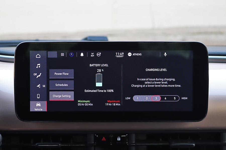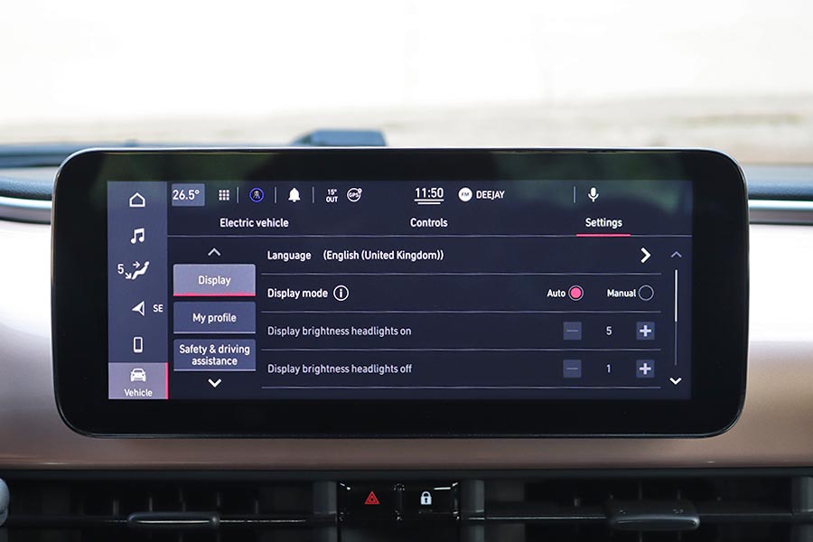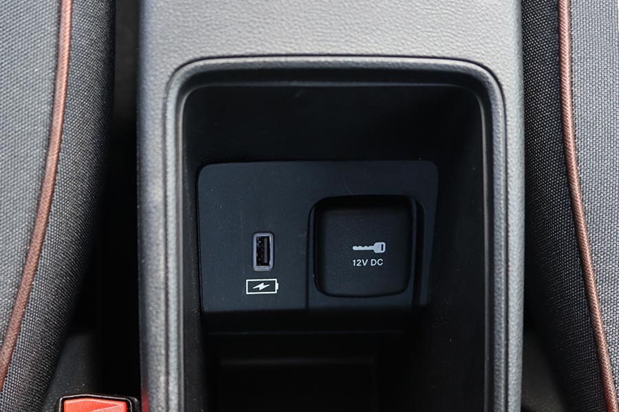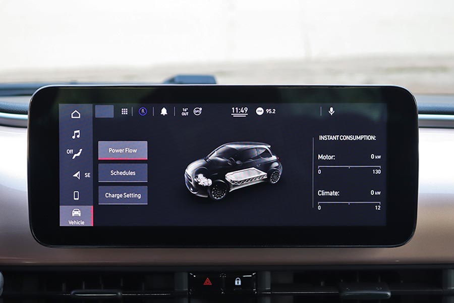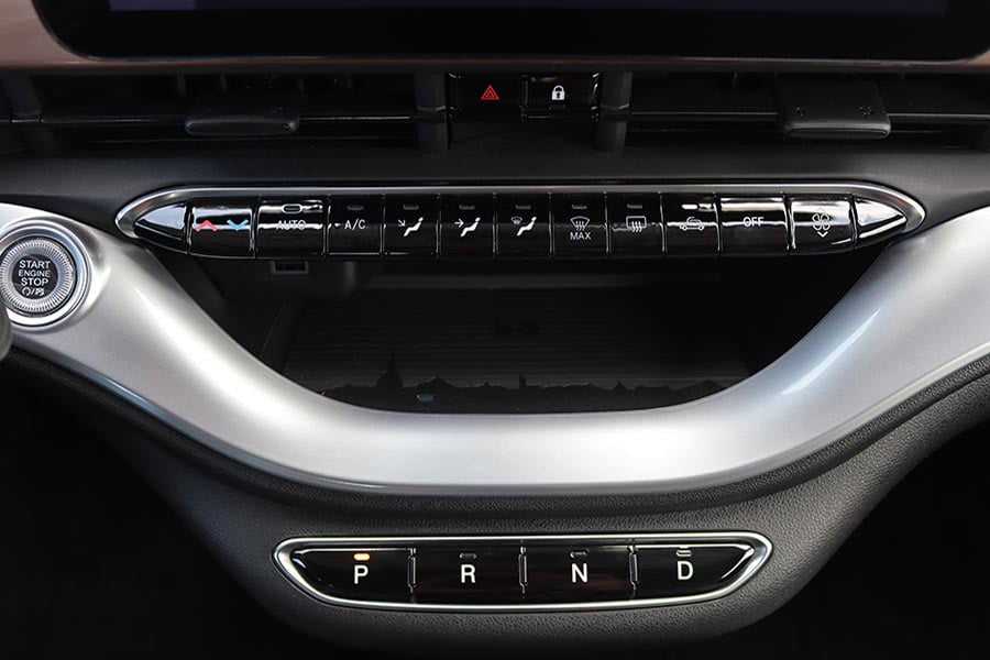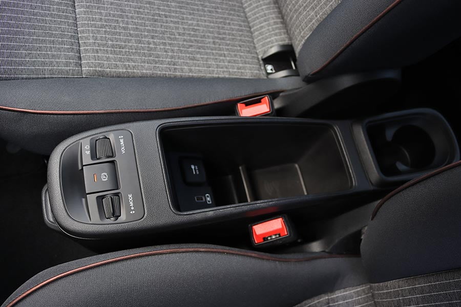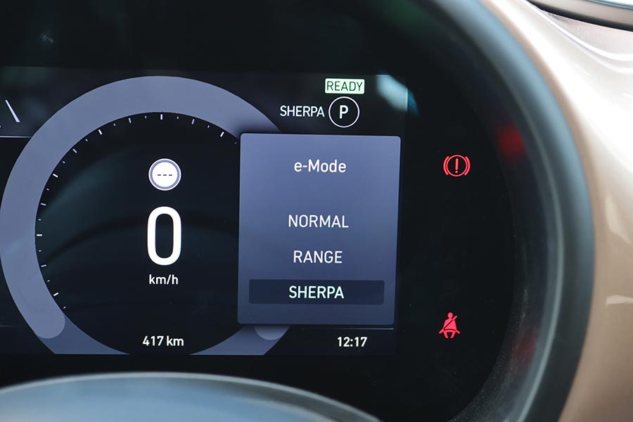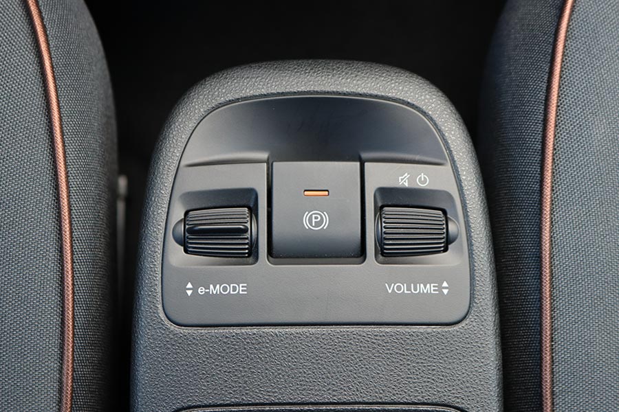 Στη θέση του επιλογέα των ταχυτήτων βρίσκονται τέσσερα πλήκτρα για τη μετάδοση της κίνησης (P, R, N, D). Ανάμεσα από τα καθίσματα υπάρχει η κονσόλα με αποθηκευτικό χώρο, μια πτυσσόμενη ποτηροθήκη, ο διακόπτης του ηλεκτρικού χειρόφρενου και τα χειριστήρια για την ένταση του ήχου και την επιλογή των οδηγικών προφίλ του e-Mode (Normal, Range και Sherpa). Το Normal προσομοιάζει την αίσθηση ενός συμβατικού αυτοκινήτου εσωτερικής καύσης και στο Range ενεργοποιείται η λειτουργία «one-pedal-drive» (φρενάρει έντονα το αυτοκίνητο με το άφημα του γκαζιού, ανακτώντας ενέργεια). Η λειτουργία Sherpa εξοικονομεί ενέργεια βελτιστοποιώντας το επίπεδο φόρτισης της μπαταρίας, την λειτουργία του κλιματισμού, την ταχύτητα και την επιτάχυνση.
