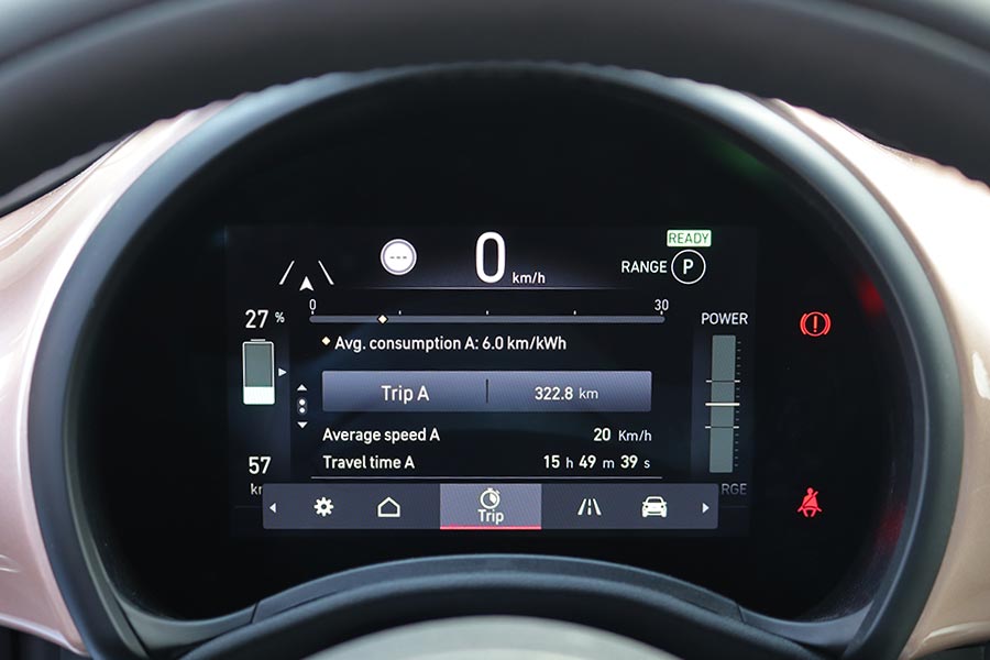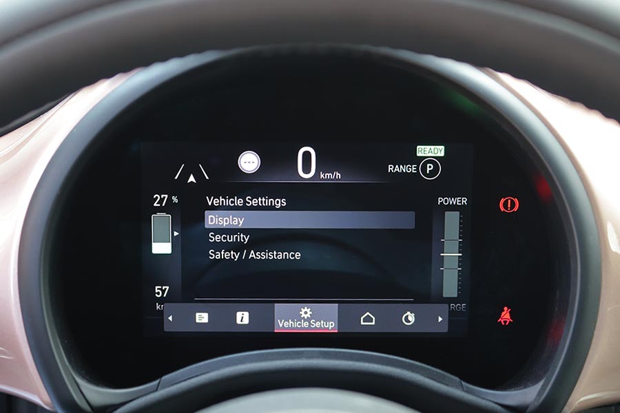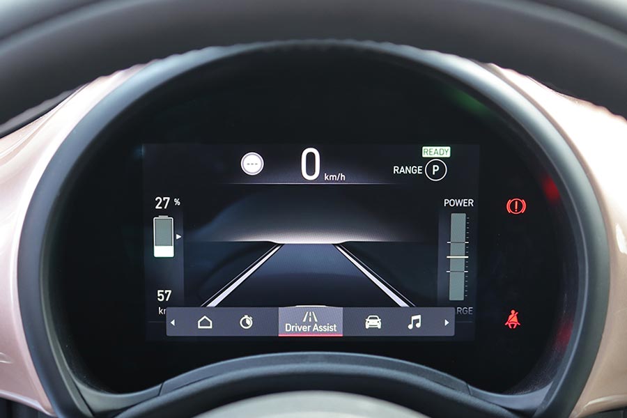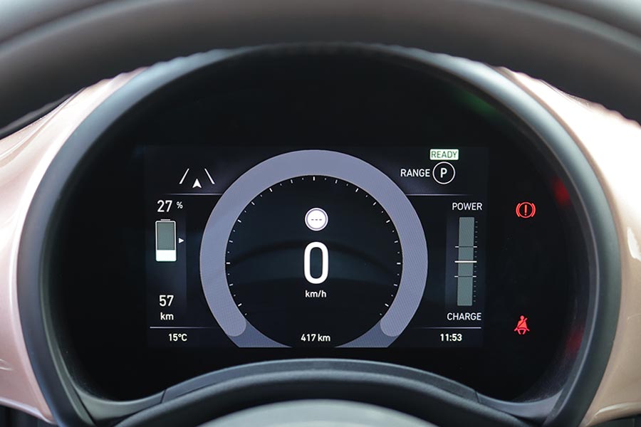 Η κλασική δομή με τα γόνατα ΜακΦέρσον μπροστά και τον ημιάκαμπτο άξονα πίσω σε συνδυασμό με το στιβαρό πλαίσιο, καταφέρνουν και φιλτράρουν με αρκετά καλό τρόπο τις διάφορες ανωμαλίες των δρόμων. Παράλληλα, χαρίζουν στο μίνι αμάξωμα πολύ καλό πάτημα στις στροφές, όπως και στις ευθείες, ακόμα και κοντά στην τελική του ταχύτητα. Όταν περνά πάνω από διαδοχικές ανωμαλίες του οδοστρώματος εμφανίζονται κάποιες ταλαντώσεις λόγω και του κοντού μεταξονίου, αλλά όχι σε ενοχλητικό βαθμό. Επίσης, παρά το συνολικό βάρος των 1.330 κιλών (294 κιλά ζυγίζουν οι μπαταρίες), το αυτοκίνητο δείχνει «ανάλαφρο» στην οδήγηση. Σε αυτό συντελεί και το εστιασμένο στην ευελιξία ελαφρύ τιμόνι, ενώ τα φρένα στη Normal λειτουργία έχουν θετική αίσθηση, σαν ενός συμβατικού αυτοκινήτου.