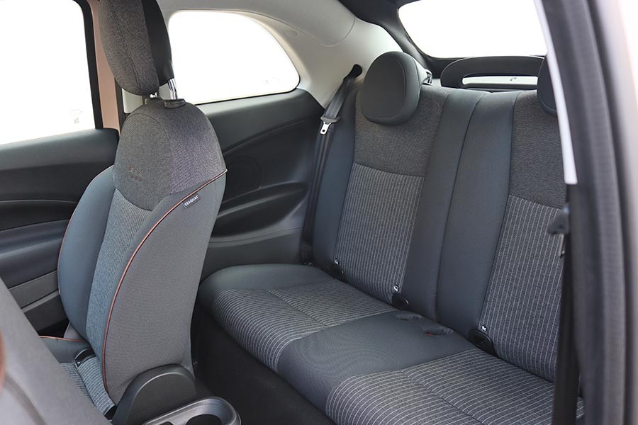 Σε επίπεδο κατασκευής, τα σκληρά πλαστικά που έχουν χρησιμοποιηθεί έχουν στιβαρή συναρμογή και ικανοποιούν με την υφή τους. Τα καθίσματα είναι άνετα, όμως η ψηλή θέση οδήγησης και το γεγονός ότι δεν υπήρχε ρύθμιση σε ύψος (στο αυτοκίνητο του τεστ), ενδεχομένως να μη διευκολύνει τους πιο ψηλούς. Επίσης, σε σχέση με το συμβατικό 500, το ηλεκτρικό 500 είναι λίγο πιο άνετο σε χώρους χάρη και στο επίπεδο δάπεδο, όμως το πίσω κάθισμα προορίζεται κυρίως για μετακινήσεις παιδιών. Τα 185 λίτρα για τις αποσκευές επαρκούν για τις καθημερινές ανάγκες, αν και το μικρό άνοιγμα του καπό (δεν σηκώνεται το παρμπρίζ όπως στο hatchback) δυσχεραίνει τη φωρτο-εκφόρτωση.