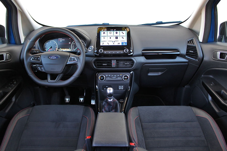 Μετά την τελευταία ανανέωση, το εσωτερικό του Ford EcoSport βελτιώθηκε σε σχεδιασμό, ποιότητα και εξοπλισμό, αποκτώντας συνολικά μια σημαντικά πιο αναβαθμισμένη και σύγχρονη εικόνα. Οι ομοιότητες με το νέο Fiesta είναι παραπάνω από εμφανείς στο ταμπλό, όπου κυριαρχεί η μεγάλη οθόνη αφής των 8 ιντσών του συστήματος πολυμέσων SYNC 3, η οποία είναι τοποθετημένη σε περίοπτη θέση. Αναβαθμισμένη είναι και η ποιότητα των υλικών με τη χρήση λεπτού μαλακού υλικού στο ταμπλό, ενώ η συναρμογή είναι στιβαρή. H έκδοση ST-Line διαθέτει και αρκετά στοιχεία που του χαρίζουν πιο σπορτίφ εμφάνιση, όπως είναι τα πεντάλ αλουμινίου, οι κόκκινες ραφές στο τιμόνι, χειρόφρενο, επιλογέα ταχυτήτων και καθίσματα, το επίπεδο στο κάτω μέρος τιμόνι, οι επενδύσεις από δέρμα και ύφασμα κ.λπ. Από πλευράς χώρων, το εσωτερικό του EcoSport προσφέρει καλές ανέσεις για τέσσερις ενήλικους επιβάτες. Το πορτ μπαγκάζ των 356 λίτρων έχει αρκετό ωφέλιμο ύψος, όμως το άνοιγμα της πόρτας προς τα έξω και όχι προς τα πάνω δεν είναι καθόλου πρακτικό, ειδικά όταν από πίσω υπάρχει λίγος ελεύθερος χώρος.