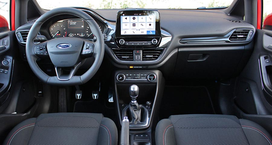 Η σπορτίφ ατμόσφαιρα κυριαρχεί και στο εσωτερικό του Fiesta ST-Line, την οποία συνθέτουν διάφορα επιπλέον χαρακτηριστικά. Αυτά εντοπίζονται στα σπορ εμπρός καθίσματα με τις κόκκινες και λευκές ραφές, στα αλουμινένια πεντάλ, στο τιμόνι με τη δερμάτινη επένδυση τις λευκές ραφές και το επίπεδο κάτω τμήμα, στο δερμάτινο επιλογέα ταχυτήτων με την επένδυση αλουμινίου, στη μαύρη οροφή και στα καλύμματα μαρσπιέ με λογότυπο ST-Line στις εμπρός πόρτες. Τη μοντέρνα εικόνα του εσωτερικού ενισχύει με την σειρά της και η στάνταρ οθόνη αφής 8,0 ιντσών του συστήματος πολυμέσων SYNC3. Ποιοτικά είναι προσεγμένο και διαθέτει λεπτό αφρώδες υλικό στο πάνω μέρος του ταμπλό, καλής ποιότητας σκληρά πλαστικά και φινίρισμα. Οι διαθέσιμοι χώροι βρίσκονται στο μέσο όρο της κατηγορίας, τόσο για τους επιβάτες, όσο και για τις αποσκευές (292 λτ.).