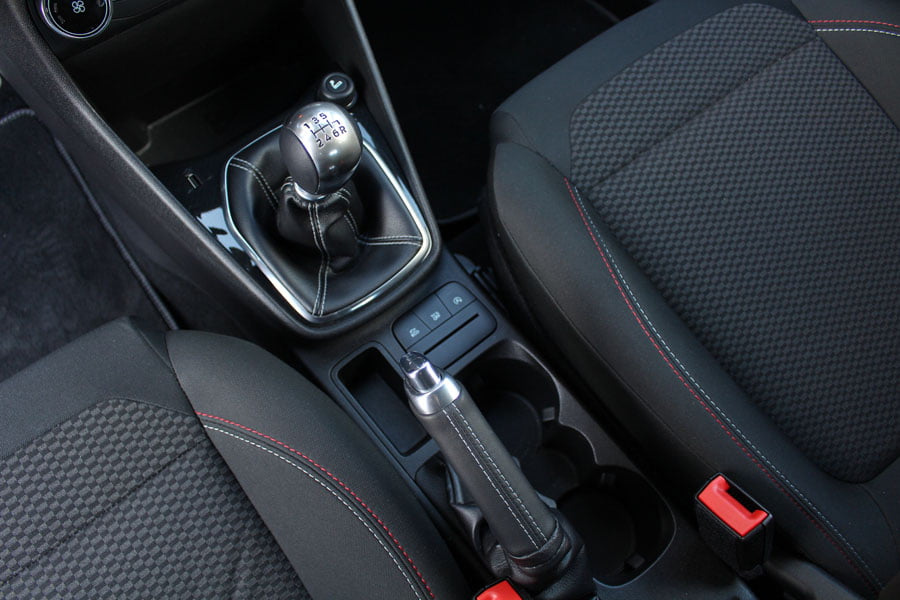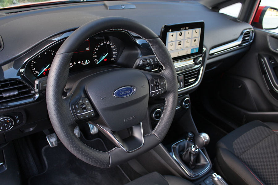 Η σπορτίφ ατμόσφαιρα κυριαρχεί και στο εσωτερικό του Fiesta ST-Line, την οποία συνθέτουν διάφορα επιπλέον χαρακτηριστικά. Αυτά εντοπίζονται στα σπορ εμπρός καθίσματα με τις κόκκινες και λευκές ραφές, στα αλουμινένια πεντάλ, στο τιμόνι με τη δερμάτινη επένδυση τις λευκές ραφές και το επίπεδο κάτω τμήμα, στο δερμάτινο επιλογέα ταχυτήτων με την επένδυση αλουμινίου, στη μαύρη οροφή και στα καλύμματα μαρσπιέ με λογότυπο ST-Line στις εμπρός πόρτες. Τη μοντέρνα εικόνα του εσωτερικού ενισχύει με την σειρά της και η στάνταρ οθόνη αφής 8,0 ιντσών του συστήματος πολυμέσων SYNC3. Ποιοτικά είναι προσεγμένο και διαθέτει λεπτό αφρώδες υλικό στο πάνω μέρος του ταμπλό, καλής ποιότητας σκληρά πλαστικά και φινίρισμα. Οι διαθέσιμοι χώροι βρίσκονται στο μέσο όρο της κατηγορίας, τόσο για τους επιβάτες, όσο και για τις αποσκευές (292 λτ.).