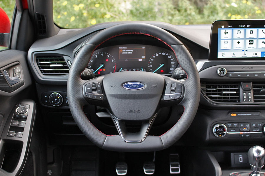 Επιπλέον, τον σπορτίφ χαρακτήρα της έκδοσης ST-Line ενισχύουν με την σειρά τους το flat bottom τιμόνι, οι κόκκινες ραφές στο τιμόνι, καθίσματα και επιλογέα ταχυτήτων, τα σπορ ανοξείδωτα πεντάλ, η μαύρη οροφή, τα διακοσμητικά με όψη ανθρακονήματος και τα λογότυπα ST-Line. Καλύτερο από ποτέ είναι και σε ποιότητα κατασκευής το νέο Ford Focus μέσω της χρήσης παχιού μαλακού πλαστικού στο μεγαλύτερο μέρος του ταμπλό και στις εμπρός πόρτες, της στιβαρής συναρμογής και του προσεγμένου φινιρίσματος.