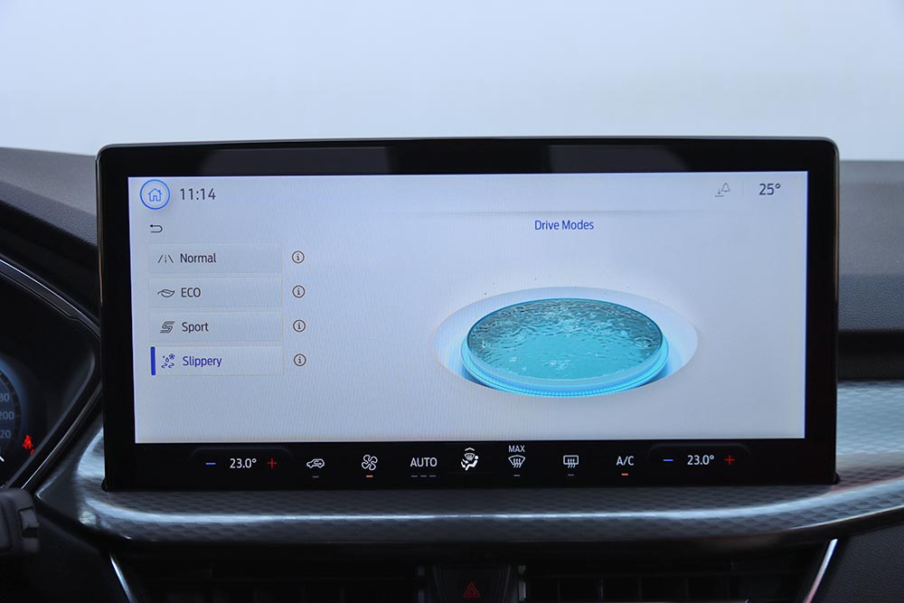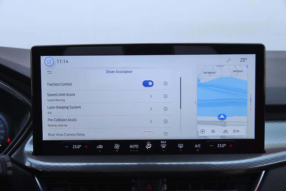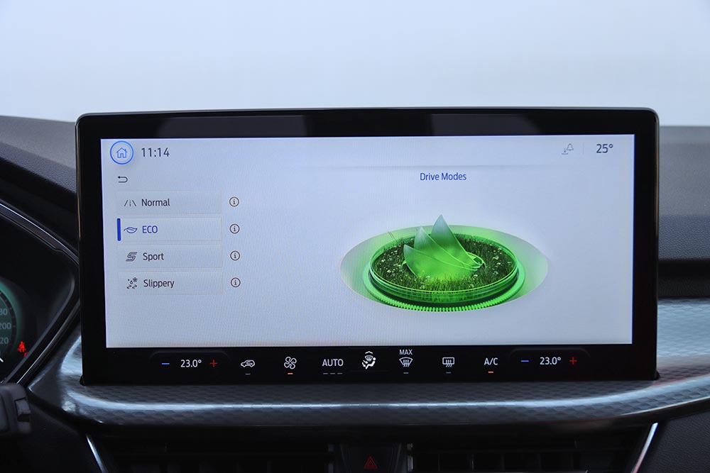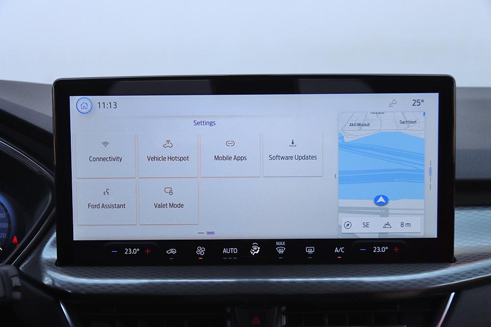 Περνώντας στο εσωτερικό του νέου Ford Kuga, τα πρώτα στοιχεία που κοιτά αμέσως κανείς είναι οι δύο ψηφιακές οθόνες. Η μία αφορά τον παραμετροποιήσιμο πίνακα οργάνων των 12,3 ιντσών και η άλλη το νέο infotainment με τη μεγαλύτερη και με πιο σύγχρονα γραφικά οθόνη αφής των 13,2 ιντσών. Το λειτουργικό σύστημα SYNC 4 ενσωματώνει πλοήγηση συνδεδεμένη στο cloud, φωνητικό έλεγχο με κατανόηση φυσικής γλώσσας, ασύρματη ενσωμάτωση Apple CarPlay και Android Auto και συνδεσιμότητα 5G FordPass για γρήγορη μεταφορά δεδομένων και ενημερώσεις λογισμικού. Στο κάτω μέρος της κεντρικής αυτής οθόνης ενσωματώθηκαν τα χειριστήρια αφής του κλιματισμού για πιο εύκολη πρόσβαση από τον οδηγό. Χαμηλότερα είναι τοποθετημένοι φυσικοί διακόπτες για το Engine Start/Stop, τους αισθητήρες παρκαρίσματος, το ξεθάμπωμα των παραθύρων, το Drive Mode και την ένταση του ραδιοφώνου.