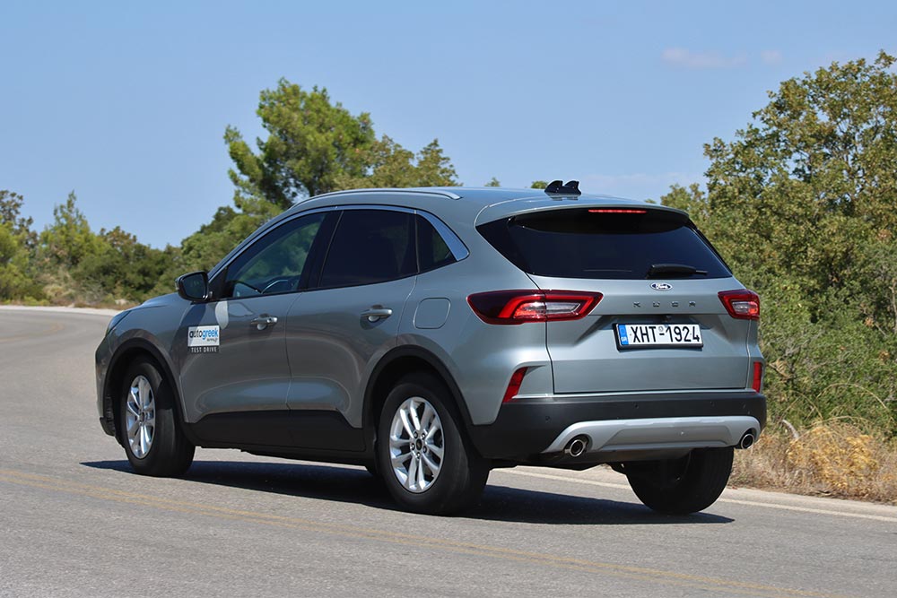 Ο πιο δυνατός 1.5 EcoBoost με τους 186 ίππους, τη ροπή των 240 Nm από τις 1.600 σ.α.λ. και το αυτόματο κιβώτιο των 8 ταχυτήτων, συνθέτουν ένα σύνολο που δεν του λείπει η δύναμη και είναι επαρκέστατο για το Kuga των 1.5+ τόνων. Παρότι το μοτέρ είναι τρικύλινδρο, ο οδηγός δεν αντιλαμβάνεται τη χαρακτηριστική χροιά ή να περνούν δονήσεις στο εσωτερικό και στα χειριστήρια, γεγονός που δείχνει πόσο μεγάλη προσοχή έχει δώσει η Ford και στην ηχομόνωση. Το 8τάχυτο αυτόματο κιβώτιο της Ford διαθέτει πάρα πολύ ομαλή λειτουργία και εξασφαλίζει άμεσες αλλαγές, επιταχύνοντας το μεσαίο SUV από στάση στα 100 χλμ./ώρα σε 9,9 δλ. και αβίαστα στα ανοίγματα εν κινήσει. Σε ρυθμούς ταξιδιού το μοτέρ λειτουργεί σε χαμηλές στροφές, ενώ το ηλεκτρονικά ελεγχόμενο χειριστήριο e-shifter δεν απαιτεί καμία απολύτως παρέμβαση από τη μεριά του οδηγού. Όμως από την άλλη πλευρά είναι πιθανό να ζητήσουν κάποιοι οδηγοί και χειροκίνητες αλλαγές των ταχυτήτων έστω μέσω paddles, αλλά προς απογοήτευσή τους θα διαπιστώσουν ότι δεν υπάρχει τέτοια δυνατότητα. Η κατανάλωση βενζίνης σε μεικτές συνθήκες βρέθηκε κατά τη διάρκεια της δοκιμής στα 10,4 λτ./100 χλμ., τιμή που παλαιότερα θεωρούνταν λογική, όμως με τα τωρινά δεδομένα των υβριδικών συνόλων είναι αυξημένη. Αν για παράδειγμα το συγκρίνουμε με το Kuga 2.5 Duratec FHEV 180 PS η διαφορά είναι μεγάλη, καθώς το υβριδικό Kuga καίει 6 λτ./100 χλμ. ή και χαμηλότερα σε αστικές συνθήκες.
