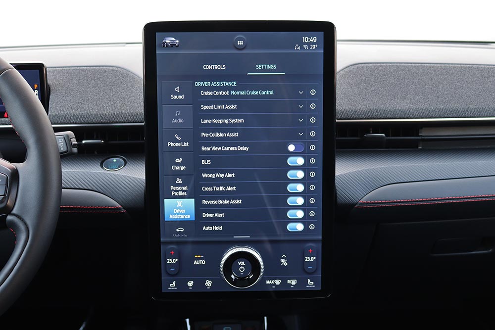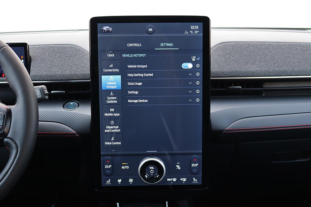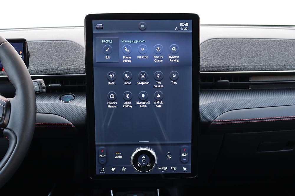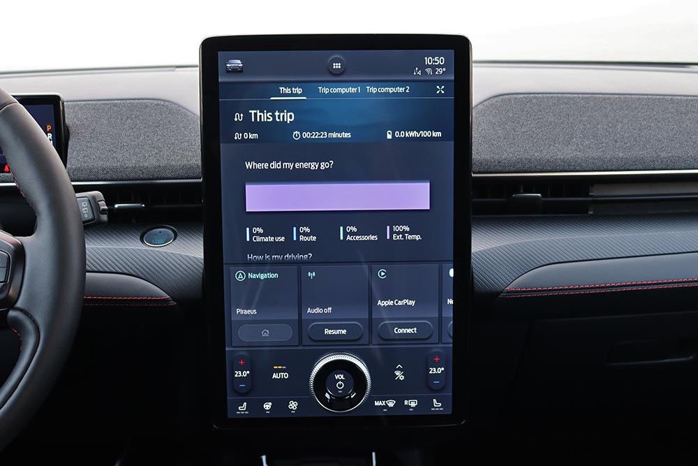 Ο λόγος φυσικά για την καμπίνα της Mach-E, με τη σχεδιαστική της φιλοσοφία να είναι σύμφωνη με ότι ορίζει η τάση της εποχής μας. Δηλαδή μιλάμε για ένα εσωτερικό το οποίο είναι minimal, χωρίς την ενσωμάτωση περιττών κουμπιών, μιας και τα πάντα ελέγχονται από την κεντρική και κάθετα τοποθετημένη οθόνη αφής. Βέβαια στην περίπτωση της Mustang η οθόνη αυτή είναι άκρως χορταστική αφού η διαγώνιος της αγγίζει τις 15,5 ίντσες, ενώ υπάρχει ένα μια ακόμα 10,2 ιντσών που φροντίζει για την ενημέρωση του οδηγού. Η νέα Mustang Mach-E εξοπλίζεται με την προηγμένη γενιά του SYNC4, με δυνατότητα εξατομίκευσης περισσοτέρων από 80 ρυθμίσεων του αυτοκινήτου, και μάλιστα ανάλογα με το προφίλ του οδηγού. Αναβαθμισμένη είναι και η εφαρμογή FordPass Connect, που προσφέρει μία σειρά από ασύρματες λειτουργίες και πληροφορίες για το όχημα μέσω smartphone.