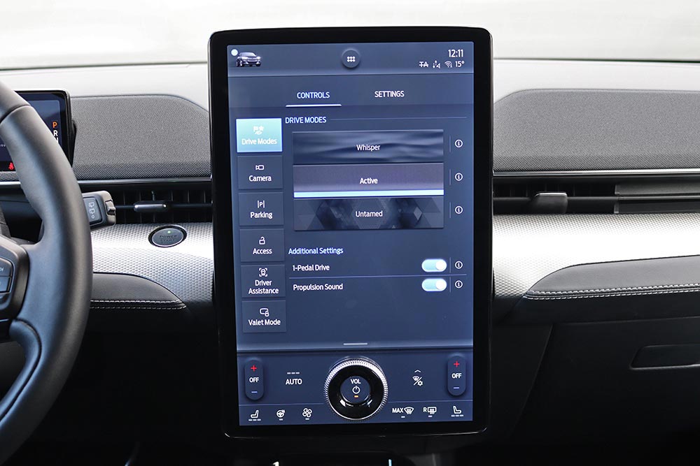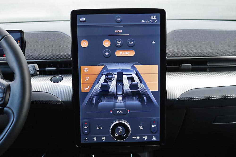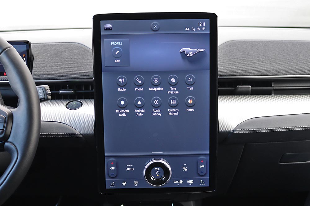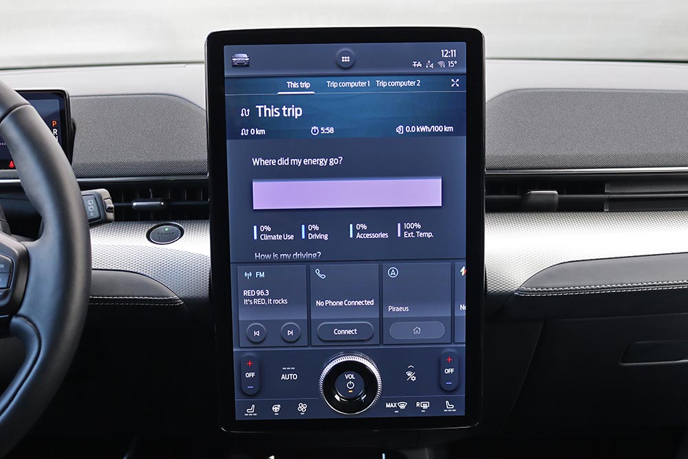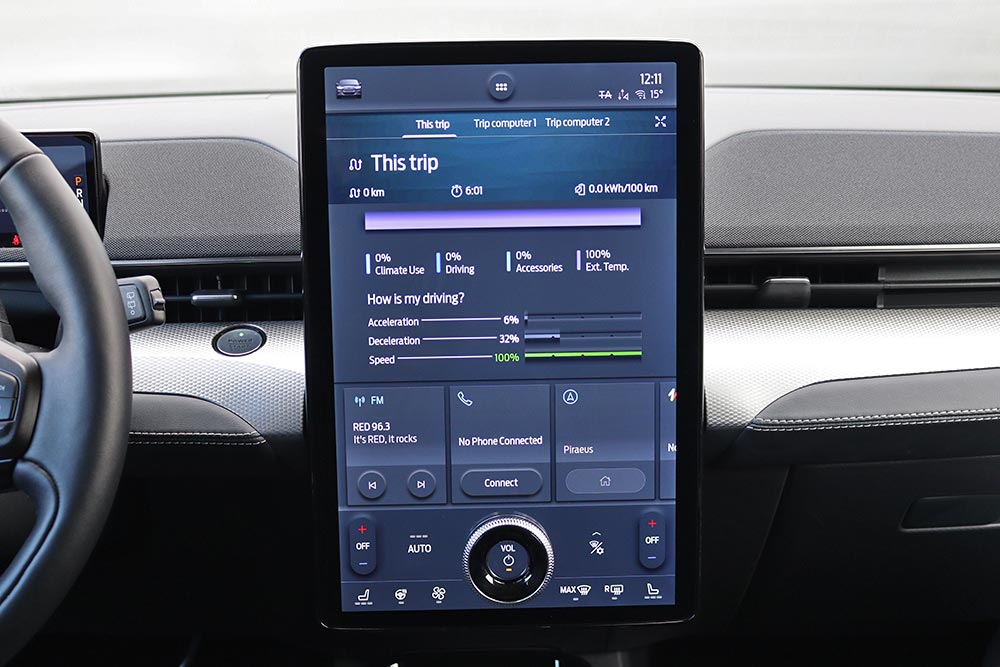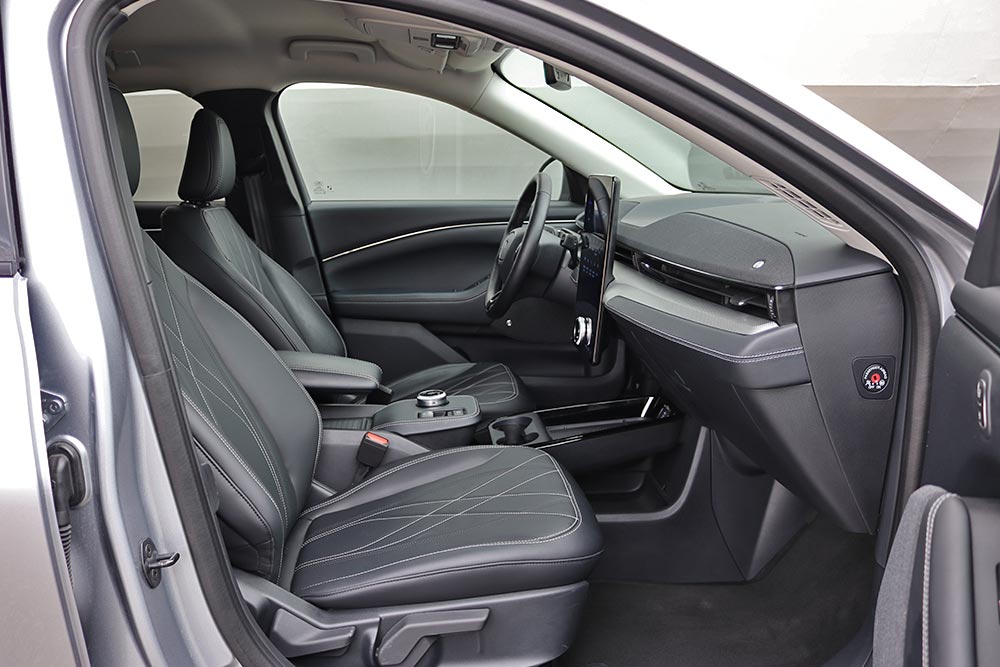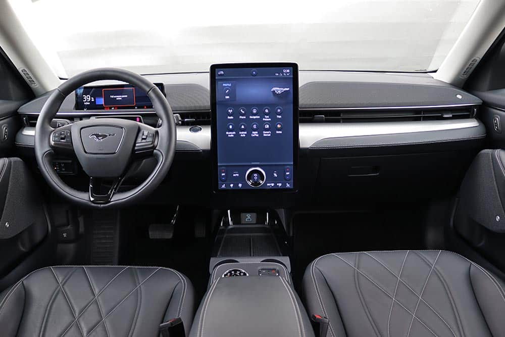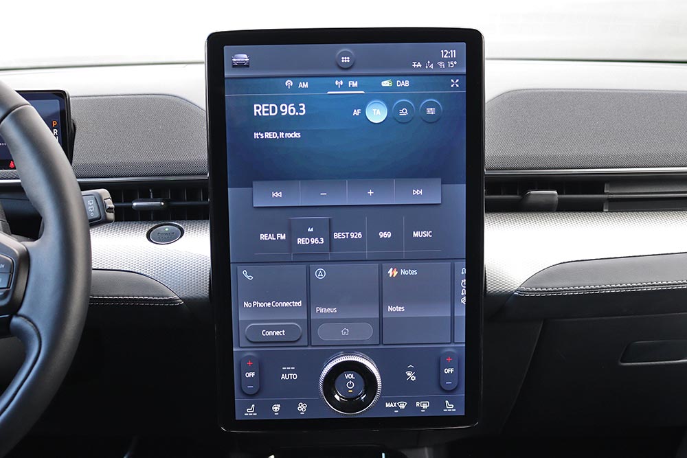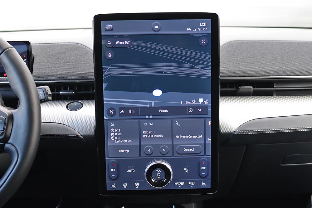 Μόλις κάτσετε στο πολύ αναπαυτικό κάθισμα θα εντυπωσιαστείτε από την τεράστια και κάθετα τοποθετημένη οθόνη αφής των 15,5 ιντσών, αλλά κι από τον ψηφιακό πίνακα οργάνων των 10,2 ιντσών. Η νέα Mustang Mach-E εξοπλίζεται με την προηγμένη γενιά του SYNC4, με δυνατότητα εξατομίκευσης περισσοτέρων από 80 ρυθμίσεων του αυτοκινήτου, ανάλογα με το προφίλ του οδηγού. Από πλευράς κατασκευής, τα μαλακά υλικά στις πόρτες χαρίζουν μια πολυτελή εικόνα, ωστόσο το σκληρό πλαστικό στο ταμπλό θα μπορούσε να καλύπτονταν από αφρώδη επένδυση.