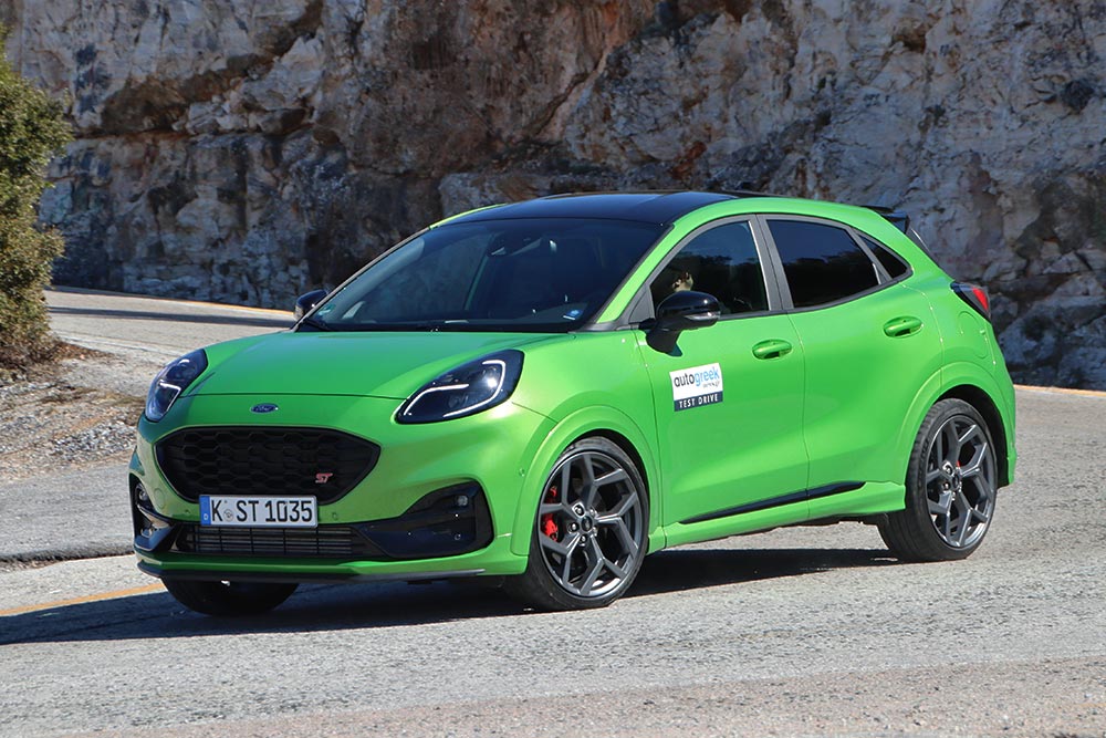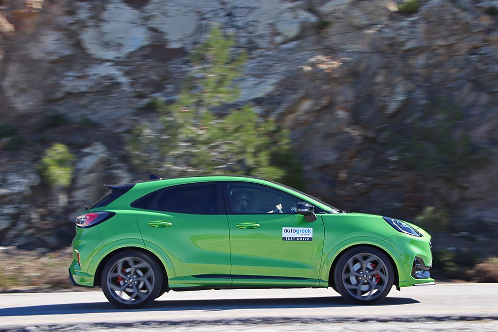 Δεν είναι καθόλου υπερβολή να πούμε ότι το Puma ST στρίβει εντυπωσιακά, δίχως να φέρνει τον οδηγό του σε δύσκολη θέση και να τον αγχώνει, ακόμα και όταν είναι υπό έντονη γωνία με το γκάζι στο πάτωμα. Απλά το τοποθετείς, το στρίβεις και το «αιλουροειδές» γαντζώνει στην άσφαλτο ακολουθώντας την προεπιλεγμένη πορεία. Χωρίς να το καταλάβεις, έχεις βρεθεί στην έξοδο της στροφής με τον κινητήρα να χτυπάει κόφτη. Το διαφορικό περιορισμένης ολίσθησης (LSD) κάνει πολύ καλά τη δουλειά του, αφού δεν αφήνει το Puma ST να ανοίξει την τροχιά του. Με γεμάτο γκάζι στην στροφή και ενώ είσαι έτοιμος να διορθώσεις τα «μούτρα» που θα πετάξει, το εμπρός μέρος του αυτοκινήτου αρνείται να υποστρέψει και «μαζεύεται» προς το εσωτερικό της στροφής. Έτσι σε βοηθά να εκμεταλλευτείς πλήρως τα αποθέματα ισχύος του δυνατού μοτέρ. Παράλληλα, το κοφτερό τιμόνι και τα δυνατά φρένα αποτελούν σύμμαχους του οδηγού στο συνεχόμενο «φρένο – γκάζι – στρίψιμο». Μια διαδικασία που εκτινάσσει την αδρεναλίνη στα ύψη και τη συνοδεύει από τη ευχάριστη μυρωδιά των ελαστικών που πιέζονται σε κάθε στροφή, αφήνοντας το Puma ST να γλιστρήσει απολύτως προοδευτικά και ελεγχόμενα. Η άνεση από τις αναρτήσεις και τα χαμηλοπρόφιλα ελαστικά (225/40 ZR19) δεν ανήκει στα φόρτε του αυτοκινήτου, με κάθε ανωμαλία του οδοστρώματος να γίνεται αισθητή στο εσωτερικό. Αναμενόμενο άλλωστε από ένα τέτοιο αυτοκίνητο.