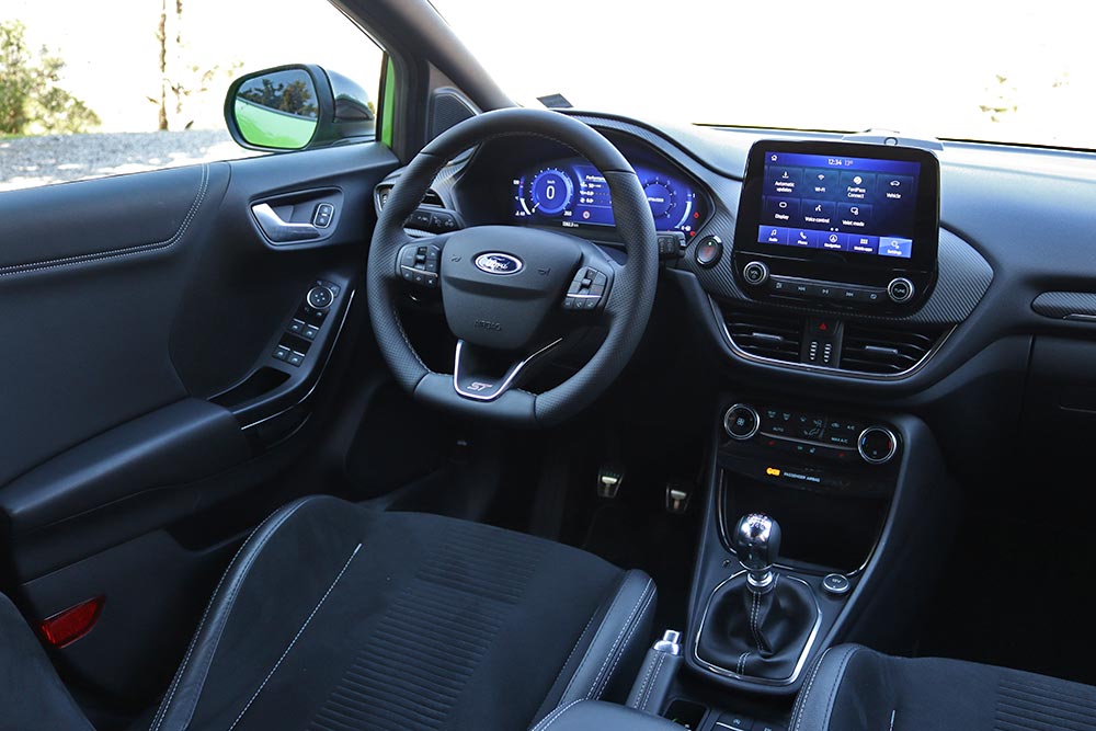 Στα μοναδικά γνωρίσματα του Puma ST ανήκουν ακόμα οι επενδύσεις με υφή ανθρακονήματος στο ταμπλό, το flat-bottom τιμόνι με την παχιά στεφάνη, τη διάτρητη επένδυση και τη μεταλλική γκρι ραφή, καθώς και η δερμάτινη λαβή χειρόφρενου και μοχλού ταχυτήτων ST. Παράλληλα ξεχωρίζουν τα μεταλλικά καλύμματα στα μαρσπιέ με το λογότυπο ST, τα πεντάλ ελαφρού κράματος και τα ειδικά ταπέτα. Κατά τα γνωστά πρότυπα, η οθόνη αφής 8 ιντσών και ο πλήρως ψηφιακός πίνακας οργάνων με οθόνη 12,3 ιντσών TFT LCD τραβούν κατευθείαν τα βλέμματα, με το χρωματισμό και τα γραφικά να αλλάζουν αναλόγως του επιλεγμένου προγράμματος οδήγησης (Normal, Eco, Sport, και Race track). Η ποιότητα των υλικών, η συναρμογή και το φινίρισμα βρίσκονται σε πολύ καλό επίπεδο, με τα υλικά που χρησιμοποιούνται στο ταμπλό να είναι στο μεγαλύτερο μέρος μαλακά. Οι χώροι είναι ικανοποιητικοί για τέσσερις επιβάτες, ενώ μεγάλο είναι το πορτ μπαγκάζ των 456 λίτρων, μαζί με τα 80 λίτρα του MegaBox που υπάρχει κάτω από το δάπεδο.