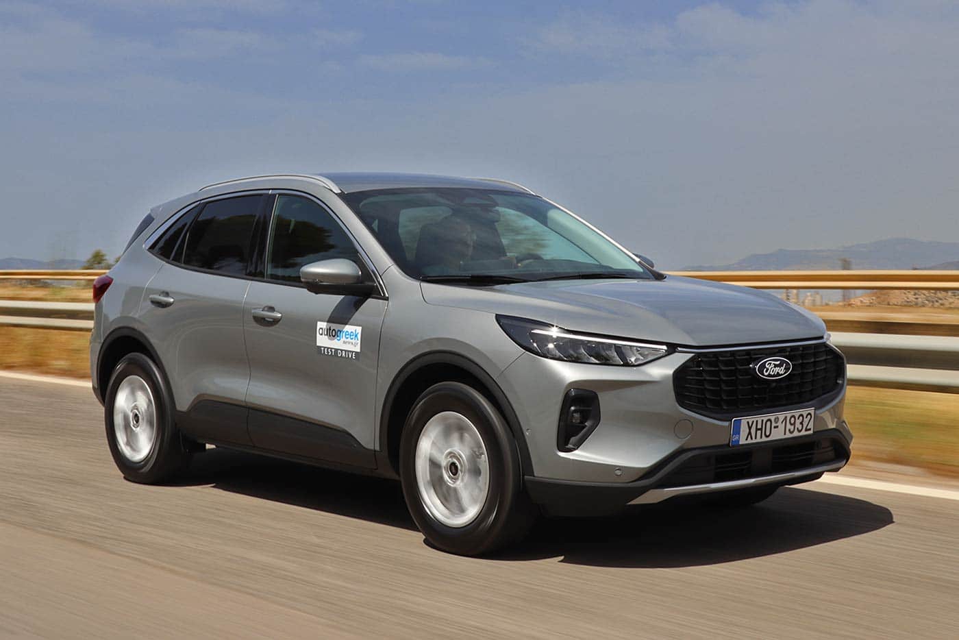 Στις ευθείες και καμπές των αυτοκινητόδρομων το νέο Kuga Hybrid παρουσιάζει υψηλή σταθερότητα, ενώ παρά τον αυξημένο του όγκο και το βάρος των σχεδόν 1,7 τόνων (με οδηγό) στρίβει σαν καλοστημένο χάτσμπακ. Χωρίς παράλληλα να «φοράει» θηριώδεις ζάντες και ελαστικά, αλλά απολύτως νορμάλ διαστάσεων 225/65 R17 στην έκδοση Titanium. Πρόσθετα, ο οδηγός λαμβάνει πολύ καλή πληροφόρηση και αμεσότητα από το τιμόνι, ενώ τα φρένα πιάνουν καλά, χωρίς νεκρή διαδρομή ή με ξερό τρόπο. Ο οδηγός έχει στη διάθεσή του και το Drive Mode με τις επιλογές Normal, Eco, Sport και Slippery, όπου αναλόγως προσαρμόζεται η απόκριση του κινητήρα, το βάρος του τιμονιού και η παρεμβατικότητα του συστήματος ελέγχου της πρόσφυσης. Αν πάλι θελήσει να πατήσει κανείς εκτός δρόμου, τα 166-174 χιλιοστά απόστασης από το έδαφος επαρκούν, αλλά φυσικά όχι για δύσβατες διαδρομές. Για αυτές υπάρχει το Kuga Active/Active X 2.5 λτ. Duratec FHEV 183 PS AWD.