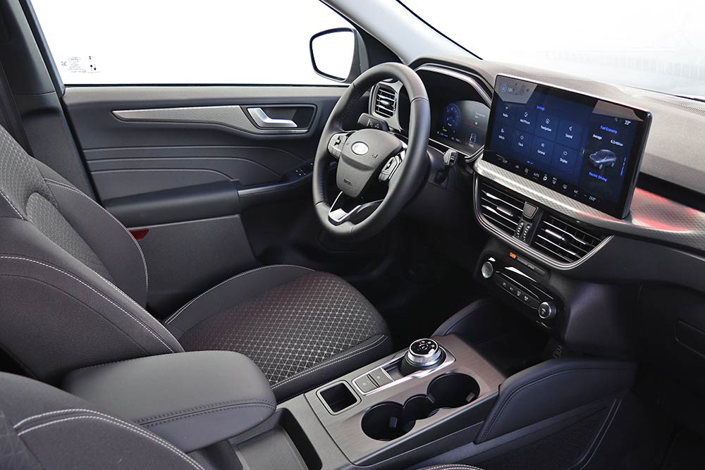 Στο θάλαμο των επιβατών του νέου Ford Kuga, το πρώτο στοιχείο που κάνει αμέσως τη διαφορά, είναι η μεγαλύτερη στάνταρ κεντρική οθόνη αφής 13,2 ιντσών (8 ιντσών πριν), συνοδεία ψηφιακού πίνακα οργάνων 12,3 ιντσών. Το νέο σύστημα πολυμέσων τεχνολογίας SYNC 4 της Ford ενσωματώνει πλοήγηση συνδεδεμένη στο cloud και συνδεδεμένο φωνητικό έλεγχο με κατανόηση φυσικής γλώσσας. Η ασύρματη ενσωμάτωση Apple CarPlay και Android Auto 2 παρέχει απρόσκοπτη συνδεσιμότητα smartphone, ενώ η συνδεσιμότητα 5G FordPass υποστηρίζει τη γρήγορη μεταφορά δεδομένων και τις ενημερώσεις λογισμικού. Στο κάτω μέρος της οθόνης ενσωματώθηκαν τα χειριστήρια αφής του κλιματισμού, που σημαίνει ότι ο οδηγός δεν ψάχνει μέσα από μενού – υπομενού για τις όποιες ρυθμίσεις. Πιο κάτω βρίσκεται νέο πάνελ με φυσικούς διακόπτες για τους αισθητήρες παρκαρίσματος, το μπουτόν του Engine Start/Stop, το ξεθάμπωμα των τζαμιών, του Drive Mode και της έντασης του ηχοσυστήματος.