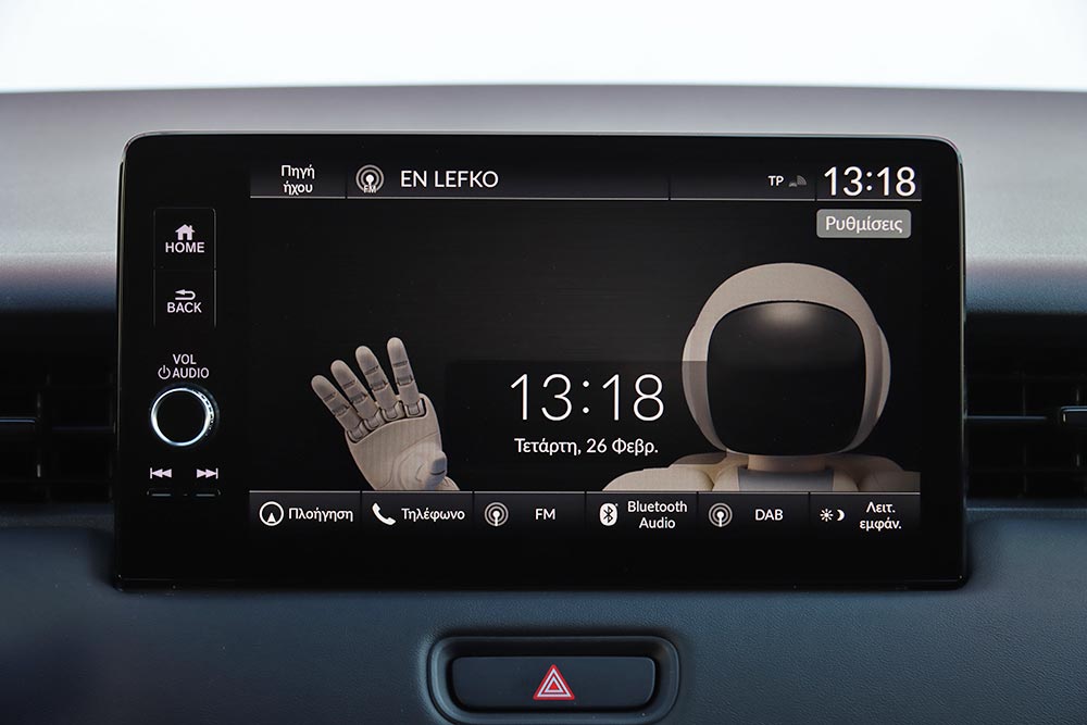 Όπως εξωτερικά, έτσι και στο θάλαμο των επιβατών του ανανεωμένου Honda HR-V οι αλλαγές είναι ελάχιστες και εστιάζονται στην επανασχεδιασμένη κεντρική κονσόλα. Εκεί αφαιρέθηκε το διαχωριστικό πάνελ, έτσι ώστε η πρόσβαση να είναι πιο εύκολη στη θήκη και στη βάση ασύρματης φόρτισης, τόσο από τον οδηγό όσο και από το συνοδηγό. Γενικά η κεντρική κονσόλα, σε φινίρισμα high-gloss piano black, είναι πλέον πιο επίπεδη και εργονομικά βελτιωμένη. Ο υπόλοιπος σχεδιασμός είναι απαράλλαχτος με τη μινιμαλιστική του αισθητική, την ευχρηστία, την πολύ καλή εργονομία και τον ευχάριστο διάκοσμο. Στο κέντρο του ταμπλό είναι τοποθετημένη η οθόνη αφής των 9 ιντσών με το εύχρηστο μενού και το περιστροφικό χειριστήριο για την ένταση του ήχου. Περιστροφικά είναι και τα χειριστήρια του κλιματισμού, ενώ διακόπτες υπάρχουν και για άλλες λειτουργίες του αυτοκινήτου (π.χ. Brake Hold και Drive Mode), τα οποία σε πολλά νέα αυτοκίνητα τα ψάχνει ο οδηγός μέσα από το λαβύρινθο των οθονών. Καινοτομία αποτελεί το σύστημα διάχυσης αέρα (Air Diffusion System), με τους αεραγωγούς σχήματος «L» (ή «Γ») να βρίσκονται ψηλά στις άκρες του ταμπλό και παρέχουν σε όλους τους επιβάτες μία αίσθηση κίνησης φυσικού αέρα. Από πλευράς κατασκευής τα πλαστικά που έχουν χρησιμοποιηθεί είναι στην πλειοψηφία τους σκληρά, αλλά συμπαγή, με εξαιρετική συναρμογή και ανάλογο φινίρισμα.