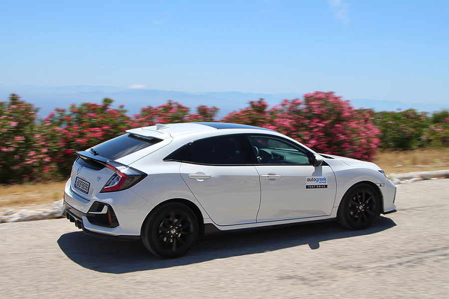 Για όσους πάλι θέλουν πιο σφιχτή ανάρτηση, αρκεί το πάτημα του κουμπιού Adaptive Performance Damper (δείχνει ένα αμορτισέρ), που βρίσκεται δίπλα από τον επιλογέα ταχυτήτων. Ωστόσο, «διαταράσσει» την άνεση που απολαμβάνουν οι επιβάτες και ενδείκνυται για διαδρομές με στροφές, όπου μειώνει τις κλίσεις του αμαξώματος. Ακόμα και με τη νορμάλ ρύθμιση, το Civic ακολουθεί πιστά τις εντολές του οδηγού και είναι προβλέψιμο και εύκολα ελεγχόμενο. Επίσης, καταπίνει με μεγάλη ευκολία και ξεκούραστα τις ευθείες των αυτοκινητόδρομων, καθώς το αμάξωμά του παραμένει ιδιαίτερα σταθερό, χωρίς ο οδηγός και οι υπόλοιποι επιβάτες να αντιλαμβάνονται με πόσα χιλιόμετρα κινείται. Στην πολύ καλή οδική του συμπεριφορά συμβάλλουν με την σειρά τους το άμεσο, ακριβές και με σωστό βάρος σύστημα διεύθυνσης, όπως και τα αποτελεσματικά φρένα.