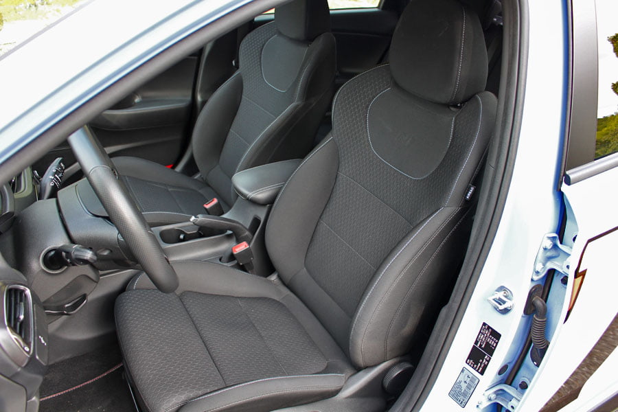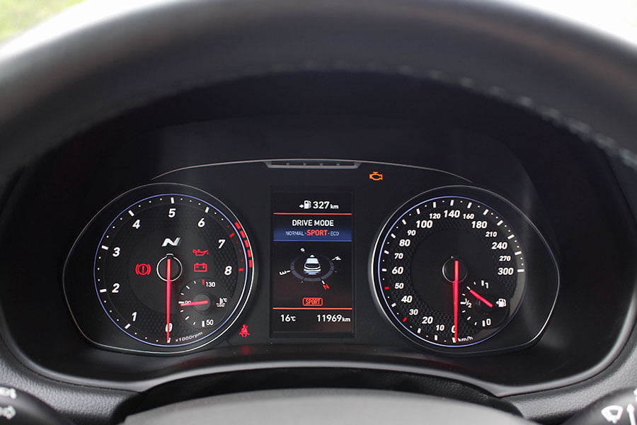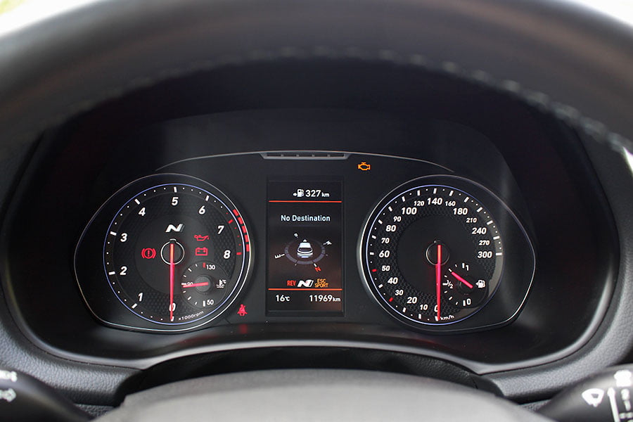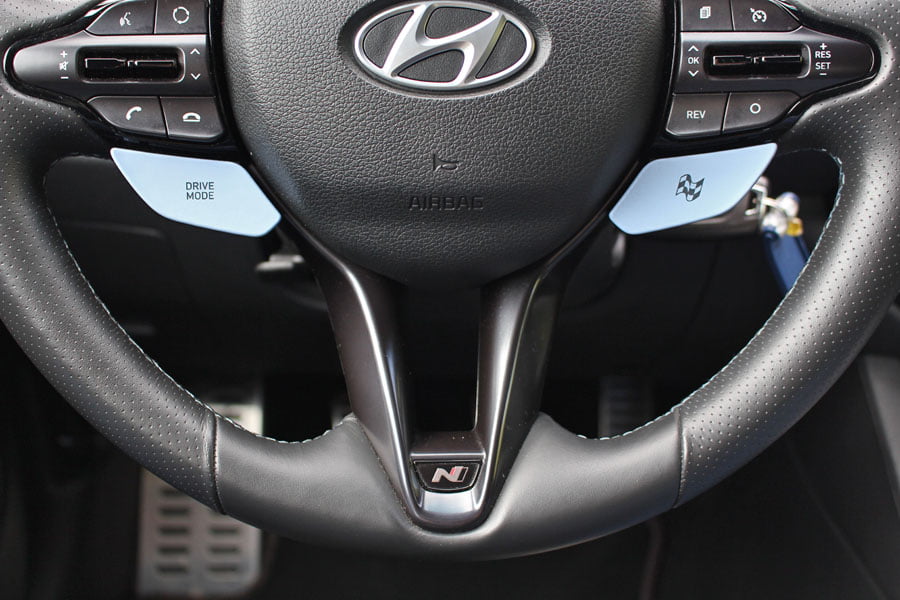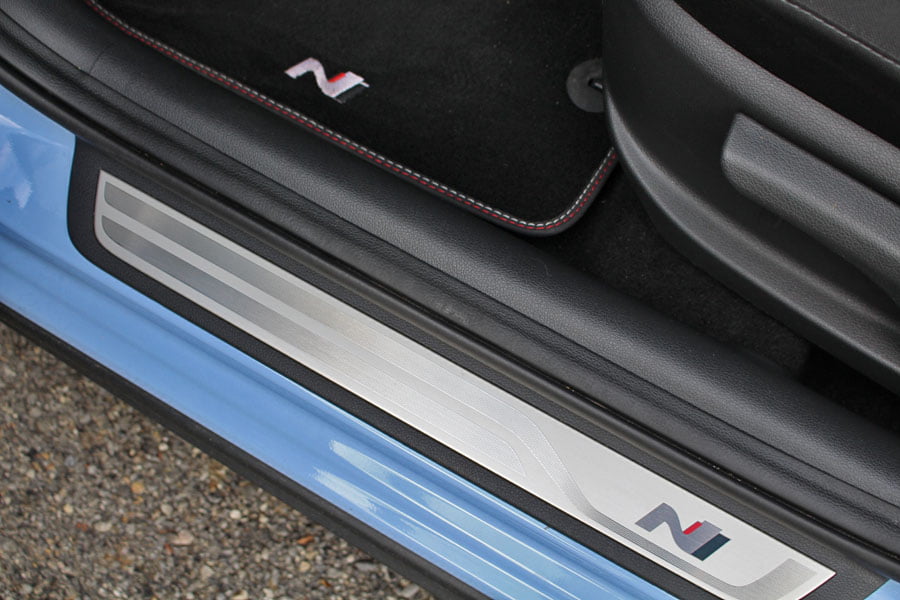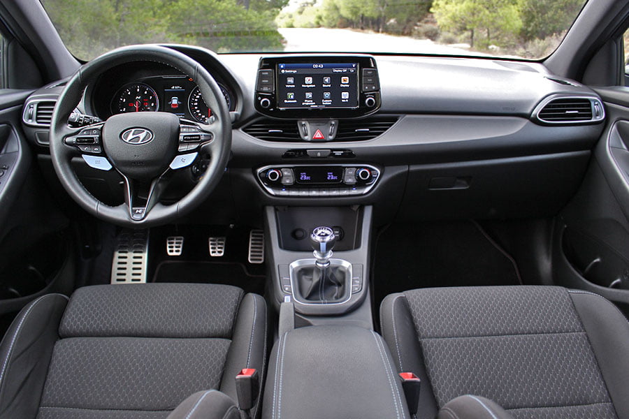 Περνώντας στο θάλαμο των επιβατών του Hyundai i30 N οι λεπτομέρειες που κάνουν τη διαφορά σε σχέση με τις υπόλοιπες εκδόσεις είναι διακριτικές. Τα μπλε πλήκτρα N στο σπορ τιμόνι, ο νέος επιλογέας ταχυτήτων, τα καθίσματα με την ενισχυμένη πλευρική στήριξη και τα ανοξείδωτα πεντάλ αποτελούν ορισμένα βασικά συστατικά. Ίσως κάποια διακοσμητικά στο ταμπλό και στις πόρτες (π.χ. αλουμινίου) να ενίσχυαν περεταίρω την αθλητική του εμφάνιση.