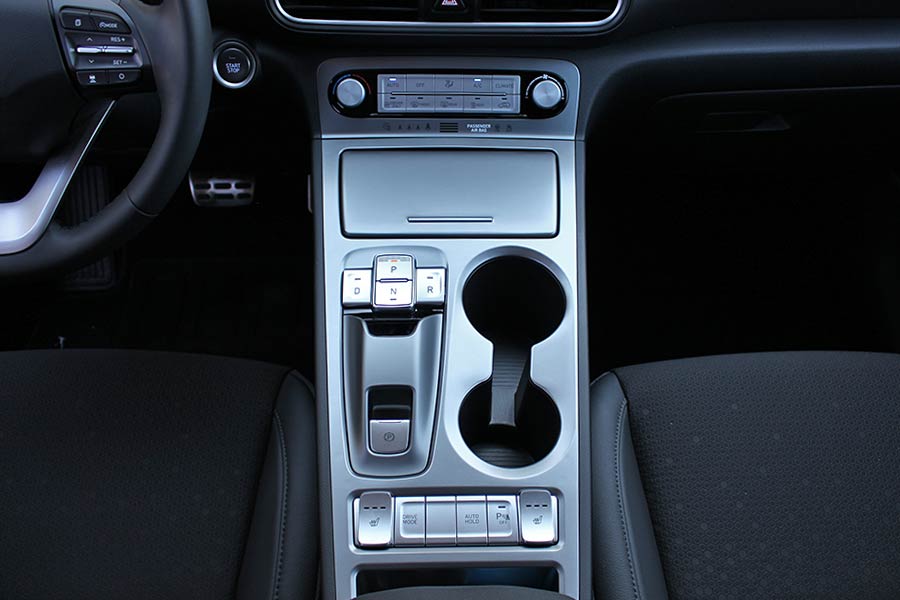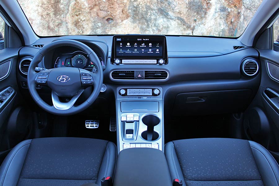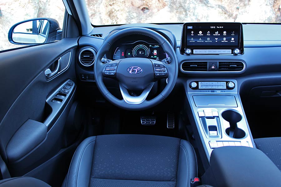 Όπως στο αμάξωμα, έτσι και στο θάλαμο των επιβατών του Kona Electric εντοπίζονται διαφορές, που χαρίζουν στο υψηλής τεχνολογίας αυτοκίνητο μια πιο ποιοτική και hi-tech εικόνα. Ο βασικός σχεδιασμός παραμένει ίδιος, όμως ο πίνακας οργάνων και η κεντρική κονσόλα είναι καινούργια. Στον ψηφιακό πίνακα οργάνων των 7 ιντσών εμφανίζονται ενδείξεις για το ταχύμετρο, το επίπεδο φόρτισης της μπαταρίας, τη ροή ενέργειας και τα προφίλ οδήγησης (Eco, Comfort και Sport). Επίσης, ανάλογα με το προφίλ, το χρώμα φόντου και οι μετρητές προσαρμόζονται ώστε να παρέχουν πάντα τις πιο σημαντικές και χρήσιμες πληροφορίες.