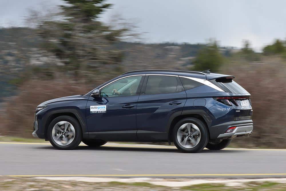 Στην πράξη, ο κινητήρας δείχνει να ταιριάζει γάντι στο συνολικό χαρακτήρα του μοντέλου. Δεν είναι τραχύς για τα μέτρα και σταθμά των ντίζελ και δε μεταφέρει έντονους κραδασμούς στην καμπίνα, ενώ συνεργάζεται ομαλά με το 7άρι αυτόματο κιβώτιο διπλού συμπλέκτη της Hyundai. Οι αλλαγές σχέσεων γίνονται γρήγορα και χωρίς απότομα τινάγματα, ενώ υπάρχει και δυνατότητα χειροκίνητης επιλογής μέσω των γνωστών paddles. Σε ταξιδιωτικούς ρυθμούς, το πετρελαιοκίνητο Tucson κρατά χαμηλά της στροφές του κινητήρα του, εκμεταλλευόμενο την πλούσια ροπή. Η κατανάλωση μπορεί να πέσει κοντά στα 6,0 λτ./100 χλμ. σε αυτές τις περιπτώσεις, αυξάνοντας τη μέγιστη αυτονομία πολύ κοντά στα 900 χλμ. (ρεζερβουάρ καυσίμου 54 λτ.). Σε μεικτές συνθήκες, οι μέσες απαιτήσεις του συνόλου φτάνουν στα 7 λτ./100 χλμ., επίδοση η οποία κρίνεται απολύτως ικανοποιητική για ένα μικρομεσαίο SUV με τετρακίνηση, αυτόματο κιβώτιο και βάρος που υπερβαίνει τα 1.600 κιλά. Ικανοποιητικές είναι και επιδόσεις του και με το πόδι στο… πάτωμα – εδώ ή μόνη ένσταση αφορά στο κάπως αργό kickdown του αυτόματου κιβωτίου – με την επιτάχυνση από στάση να ολοκληρώνεται σε 11,6 δλ. και την τελική ταχύτητα να «σταματά» στα 180 χλμ./ώρα.