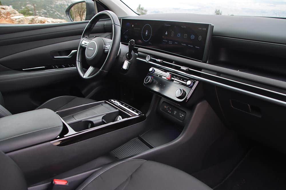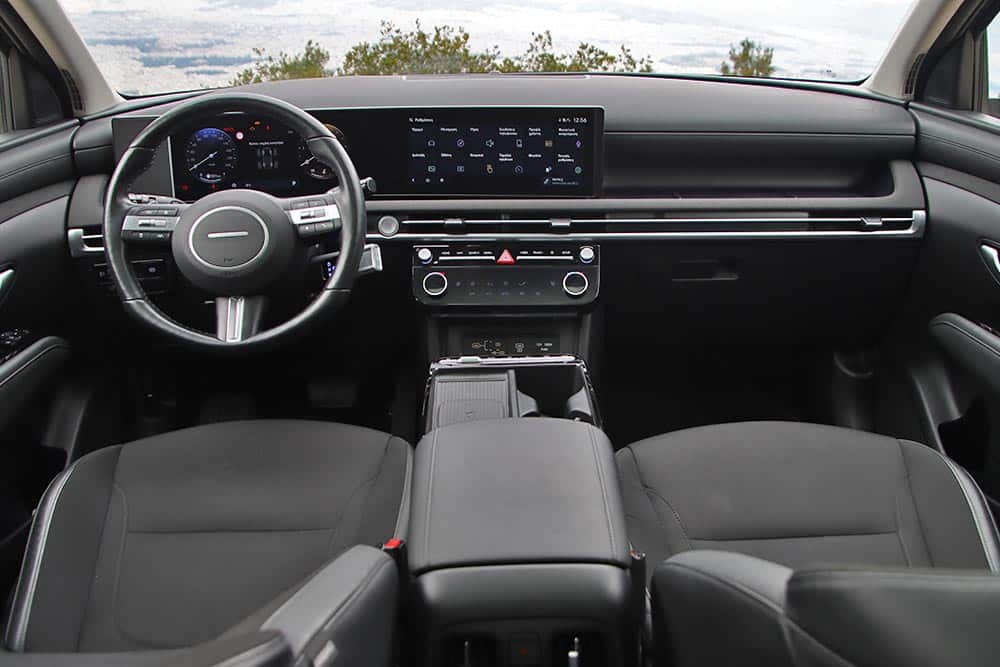 Το μεγαλύτερο άλμα σε σχέση με το πρόσφατο παρελθόν εντοπίζεται στο εσωτερικό. Η νέα πανοραμική καμπύλη επιφάνεια πίσω από το τιμόνι και πάνω από την κεντρική κονσόλα φιλοξενεί δύο οθόνες 12,3 ιντσών, μία για τον ψηφιακό πίνακα οργάνων και μία για το σύστημα infotainment – και οι δύο έγχρωμες Η εικόνα της καμπίνας είναι σύγχρονη, «καθαρή» σε επίπεδο αισθητικής και τεχνολογικά προηγμένη. Η εργονομία έχει βελτιωθεί σε σχέση με το παρελθόν, ενώ η ποιότητα των υλικών και η συναρμογή κινούνται σε πολύ καλά επίπεδα, με ευρεία χρήση μαλακών υλικών, στιβαρή συναρμογή και προσεγμένο στη λεπτομέρεια φινίρισμα. Οι χώροι παραμένουν από τα δυνατά «χαρτιά» του Tucson και στην πετρελαιοκίνητη έκδοση. Πέντε ενήλικοι θα ταξιδέψουν χωρίς περιορισμούς έχοντας στη διάθεσή τους αρκετό ωφέλιμο πλάτος, ύψος και αέρα για τα πόδια. Ο χώρος αποσκευών καλύπτει πολύ άνετα τις ανάγκες μιας οικογένειας προσφέροντας χωρητικότητα 546 λίτρων, τιμή που μπορεί να φτάσει έως και τα 1.725 λίτρα με την πλήρη αναδίπλωση της δεύτερης σειράς καθισμάτων.