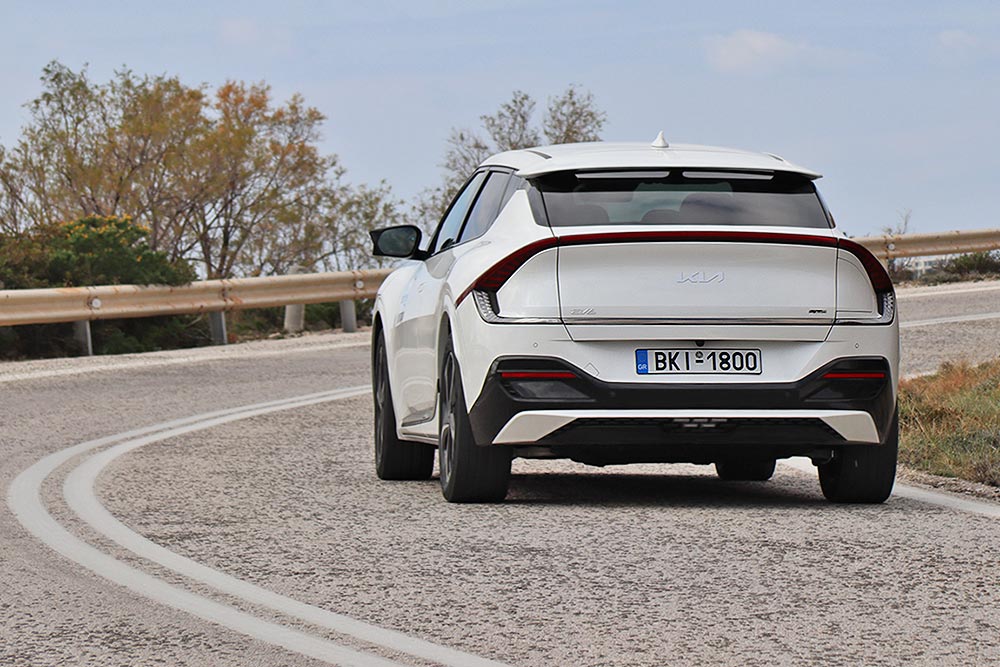 Σε κάθε περίπτωση, τόσο όταν πηγαίνει σε πιεσμένους ρυθμούς, όσο και όταν περνάει από ανωμαλίες του οδοστρώματος, το EV6 αντιδράει σαν ένα ενιαίο στιβαρό και άκαμπτο σύνολο. Ακόμα και με το πεντάλ του γκαζιού πατημένο τέρμα όπου η ώθηση είναι έντονη, το αυτοκίνητο είναι απόλυτα ελεγχόμενο και κολλάει στην άσφαλτο. Χαρακτηριστικό που γίνεται περισσότερο αντιληπτό σε κλειστές στροφές. Εκεί η πρόσφυση που εξασφαλίζουν οι τροχοί διαστάσεων 255/45 R20 σε κάνουν να νιώθεις ένα μούδιασμα στο κεφάλι σου από τα «G» της πίεσης, ενώ αυτοκίνητο παραμένει ακλόνητο στην πορεία του και το μόνο που ακούς είναι ένα ελαφρύ «σκούξιμο» από τα ελαστικά. Σύμμαχοι του οδηγού είναι το γρήγορο και επικοινωνιακό τιμόνι με τις 2,67 στροφές από άκρη σε άκρη, όπως και τα πολύ δυνατά φρένα με τους μεγάλους αεριζόμενους δίσκους εμπρός – πίσω.
