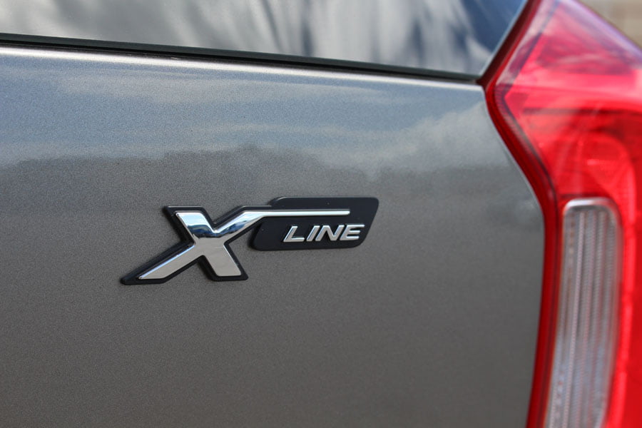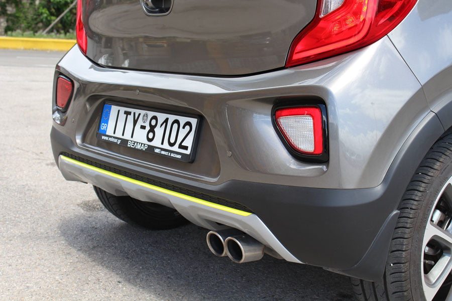 Το Kia Picanto X-Line είναι πραγματικά χάρμα οφθαλμών. Διαφέρει εμφανισιακά από τις πιο απλές εκδόσεις και ξεχωρίζει από τα διακοσμητικά ένθετα σε λαχανί χρώμα στους προφυλακτήρες και στη μάσκα, τα πλευρικά μαρσπιέ, τα προστατευτικά τμήματα γύρω από τους θόλους των τροχών, στις πόρτες, στους προφυλακτήρες και τις ασημί ποδιές. Τα τελευταία στοιχεία του χαρίζουν και μία πιο σκληροτράχηλη εικόνα, καθώς σε αυτά οφείλονται ο crossover χαρακτήρας του αλλά και οι ελαφρώς αυξημένες διαστάσεις του. Συγκεκριμένα, το Picanto X-Line έχει μήκος 3.670 χλστ. πλάτος 1.625 χλστ. και ύψος 1.500 χλστ. την στιγμή που οι διαστάσεις του απλού Picanto είναι αντίστοιχα 3.595 χλστ. 1.595 χλστ. και 1.485 χλστ. (το αυξημένο ύψος οφείλεται στη μεγαλύτερη απόσταση από το έδαφος, λόγω ανάρτησης). Τη δυναμική του εικόνα ενισχύουν με την σειρά τους οι ζάντες αλουμινίου των 16 ιντσών με ελαστικά 195/45 και η διπλή νίκελ απόληξη της εξάτμισης.