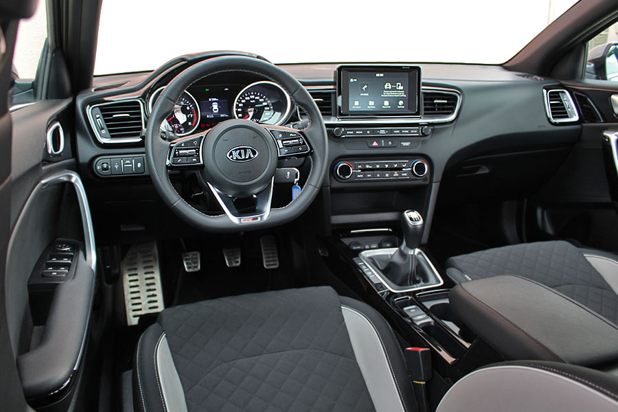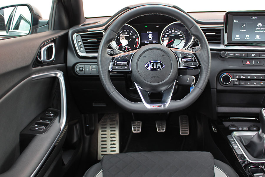 Περνώντας στο θάλαμο των επιβατών του Kia ProCeed, η εικόνα που αντικρίζει κανείς είναι αυτή ενός ποιοτικού, σύγχρονου και προσεγμένου σε κάθε λεπτομέρεια αυτοκινήτου. Τα υλικά που χρησιμοποιούνται σε όλη την επιφάνεια του ταμπλό και το μεγαλύτερο μέρος των εμπρός θυρών είναι μαλακά με ευχάριστη υφή, ενώ οι ραφές στο ταμπλό του χαρίζουν μια νότα πολυτέλειας. Πολύ προσεγμένη είναι με την σειρά της η συναρμογή μεταξύ των επιφανειών και ο σπορτίφ διάκοσμος, τον οποίο τονίζουν το flat bottomed τιμόνι, τα πεντάλ αλουμινίου, τα διακοσμητικά σε σατινέ χρώμιο και τα εμπρός καθίσματα με την ενισχυμένη πλευρική στήριξη και το λογότυπο GT Line στις πλάτες. Ο οδηγός θα βρει εύκολα την κατάλληλη θέση, θα νιώσει αναπαυτικά στο κάθισμα και θα εξοικειωθεί γρήγορα με τις θέσεις και λειτουργίες των διαφόρων χειριστηρίων. Στο κέντρο του ταμπλό κυριαρχεί η οθόνη αφής των 7 ιντσών, μέσω της οποίας ελέγχεται το σύστημα πολυμέσων και διάφορες λειτουργίες του αυτοκινήτου.