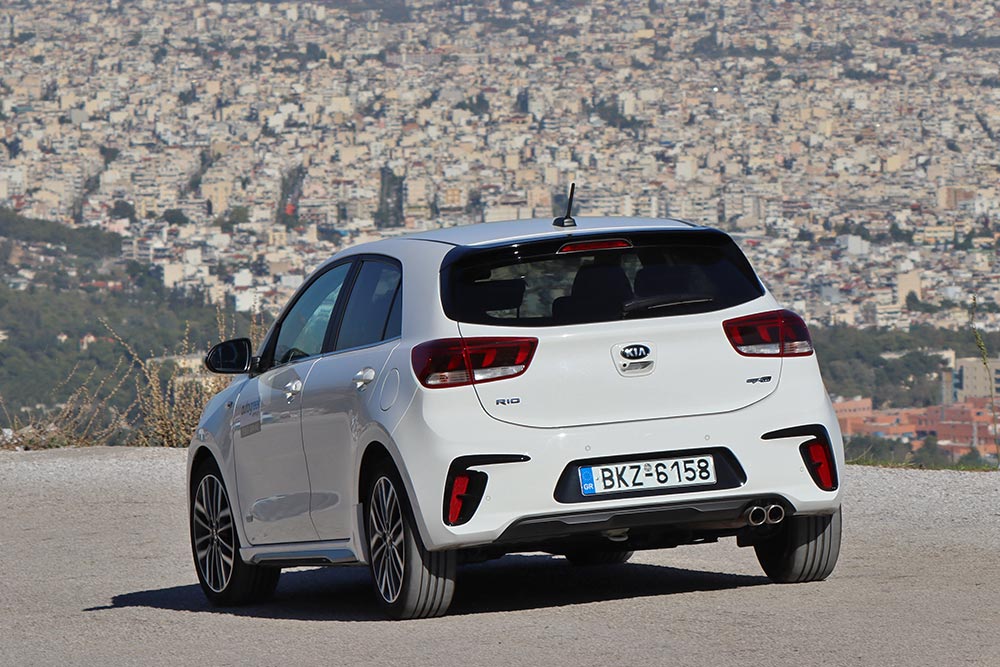 Σε πιο κακοκαιρισμένα οδοστρώματα οι θόρυβοι και κραδασμοί εντείνονται, προερχόμενοι κυρίως από τον πίσω άξονα. Ο ημιάκαμπτος αντιδρά μονοκόμματα και ηχηρά στα βαθιά κοψίματα του δρόμου, ωστόσο δεν εκτρέπει το αυτοκίνητο από την πορεία του αν συναντήσει κάτι ανάλογο εντός καμπής. Το Rio GT Line στρίβει ενιαία, με πολύ καλή αίσθηση και βάρος από το τιμόνι, που παρέχει επαρκή πληροφόρηση και αμεσότητα στην τοποθέτηση του εμπρός άξονα. Αντίστοιχες καταστάσεις για τον πίσω δύσκολα θα προκύψουν, καθώς το ESP έχει την τάση να επεμβαίνει κατά τι πρόωρα. Αν προσέξεις, όμως, και δεν βάλεις πολλή γωνία στο τιμόνι, μπορείς να πλασαριστείς γλυκά με τα τέσσερα.