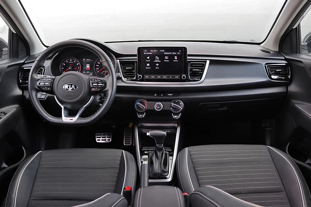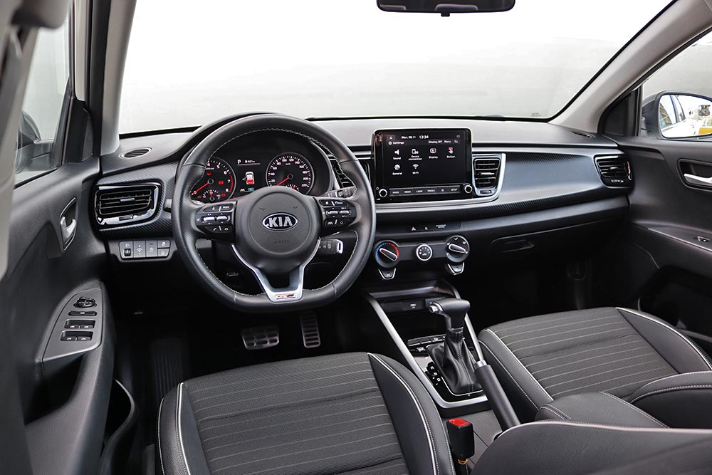Στα ενδότερα του Rio, οδηγός και επιβάτες απολαμβάνουν ευχρηστία, ευχάριστο διάκοσμο και διακριτικές σπορ πινελιές. Οι τελευταίες εκφράζονται μέσα από το επίπεδο κάτω τμήμα του τιμονιού και το σηματάκι «GT Line», τη δερμάτινη εσάνς σε τιμόνι-φούσκα επιλογέα-χειρόφρενο, τα αλουμινένια πεντάλ και την απομίμηση ανθρακονήματος στο ταμπλό. Ένα ταμπλό που αποτελείται από σκληρά μεν, πολύ καλοβαλμένα δε πλαστικά.