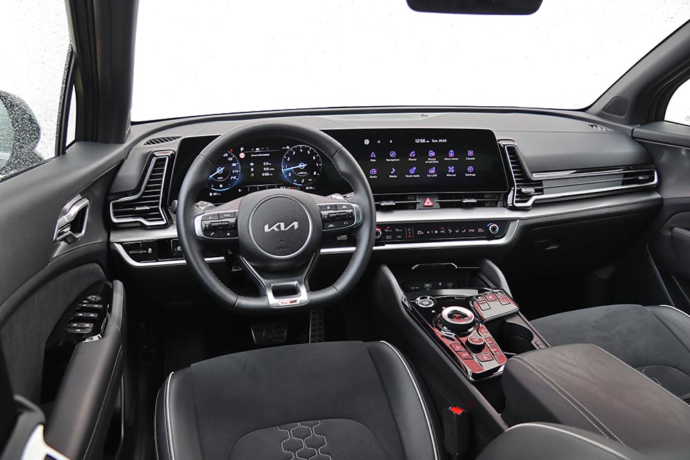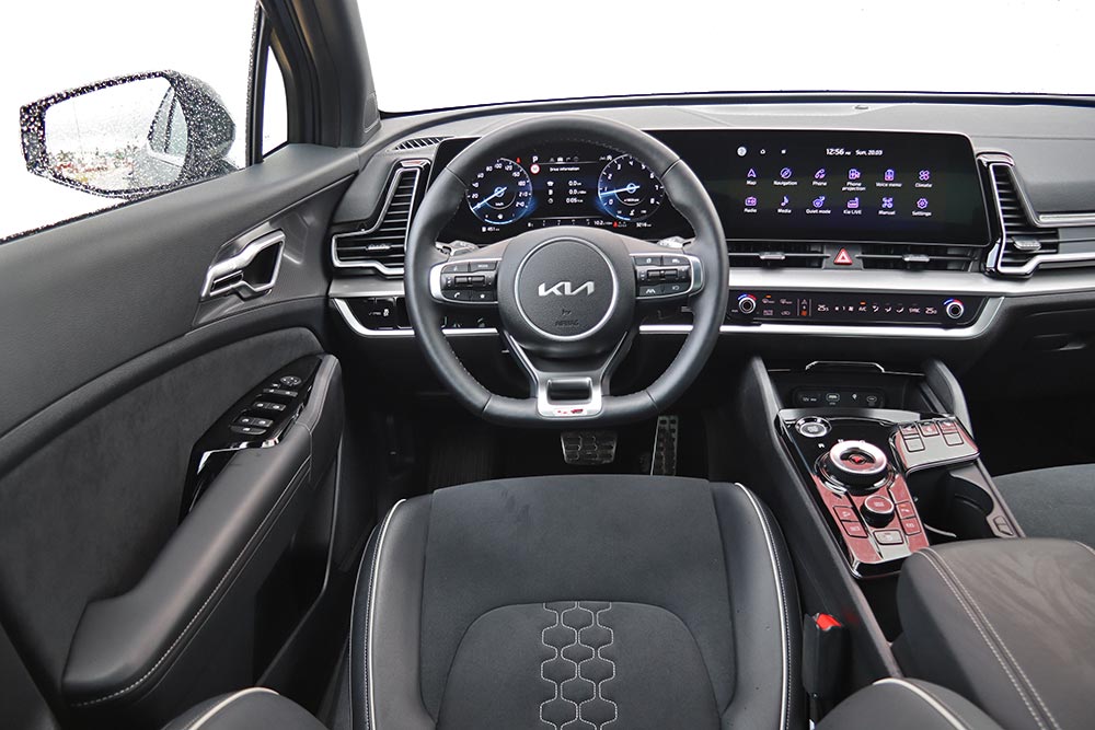 Το πάντρεμα του ψηφιακού (κυρτού κιόλας) καντράν των 12,3 ιντσών και της ίδιας διαμέτρου οθόνης αφής, δίνει μια πρωτόγνωρη νότα ψηφιακότητας στα ενδότερα του Sportage. Δεν είναι υπερβολή να πούμε πως συναγωνίζεται -και εδώ- το Kia EV6, προσφέροντας ενδεχομένως την πιο high tech εικόνα της κατηγορίας. Βέβαια τόση ψηφιακότητα απαιτεί προσαρμογή και εξοικείωση, καθώς ο «βομβαρδισμός» από γραφικά, ενδείξεις και πληροφορίες αρχικά σου δημιουργεί μια μικρο-σύγχυση. Ιδιαίτερα ο χειρισμός της δευτερεύουσας οθόνης, χαμηλά στο ταμπλό, αποσπά αρκετά το βλέμμα μέχρι να τη μάθεις.