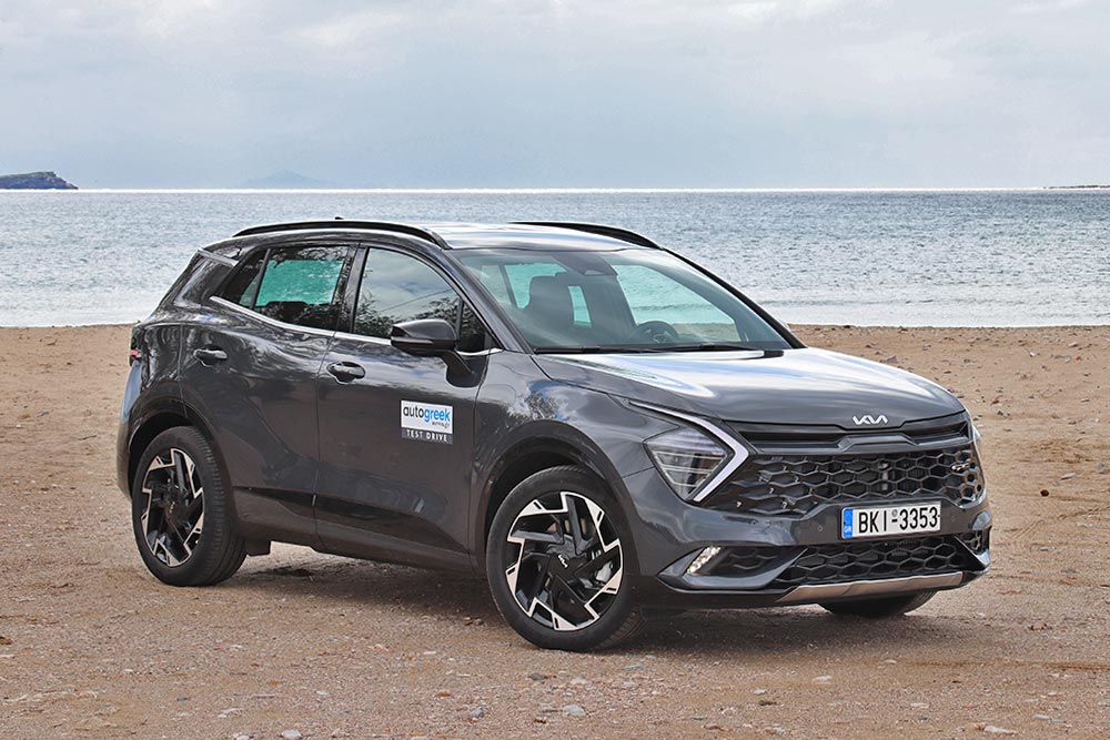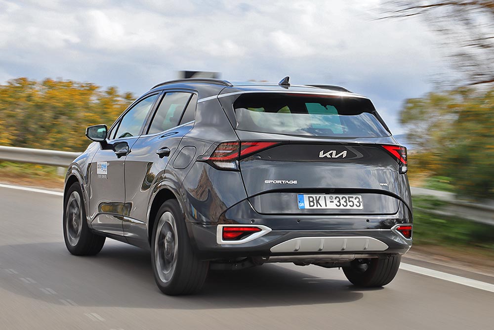 Στο πίσω μέρος συναντάμε μια παραλλαγή των φωτιστικών σωμάτων, αλλά και του σχήματος στην τρίτη κολώνα, από το EV6. Ο προφυλακτήρας επίσης εμφανίζεται ανασχεδιασμένος, με πιο μεγάλη επιφάνεια αφιερωμένη στο πλαστικό προστατευτικό και ένα ασημένιο πλαίσιο να δημιουργεί έναν ενιαίο αεραγωγό. Το GT Line της δοκιμής (από 38.790 ευρώ) ξεχωρίζει από την παρουσία διαχύτη και τις 19άρες ζάντες, ενώ και μπροστά το οπτικό φινίρισμα του προφυλακτήρα είναι πιο επιθετικό. Συνολικά, το Sportage MK5 παρουσιάζεται παντελώς αγνώριστο σε σχέση με το μοντέλο που αντικαθιστά, κοντράροντας με χαρακτηριστικότατη άνεση SUV/crossovers ακόμα και από τα πολύ υψηλά κλιμάκια της premium ιεραρχίας.