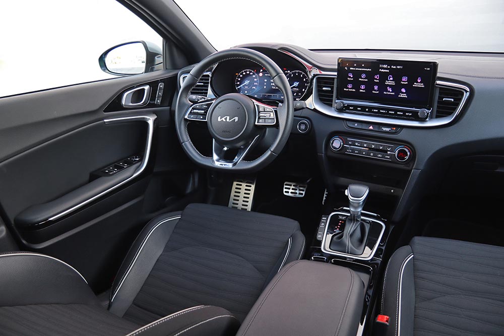 Στο θάλαμο των επιβατών του αναβαθμισμένου XCeed οι μόνες διαφορές εστιάζονται στον στάνταρ ψηφιακό πίνακα οργάνων και στη μεγαλύτερη οθόνη πολυμέσων των 10,25 ιντσών με τα σύγχρονα γραφικά και το εύκολο στη χρήση μενού. Ο σχεδιασμός είναι σύγχρονος, ο οδηγός θα βολευτεί γρήγορα στη θέση του και δεν θα αντιμετωπίσει κάποιο πρόβλημα σχετικά με την εργονομία. Σε αυτό βοηθούν και τα φυσικά χειριστήρια για τον κλιματισμό, όπως επίσης τα αφής και τα περιστροφικά που είναι τοποθετημένα στη βάση του infotainment. Ουσιαστικά νιώθει ότι γίνεται ένα με το αυτοκίνητο και ότι βρίσκεται σε ένα Crossover με σπορτίφ χαρακτηριστικά και πολυτελή στοιχεία.