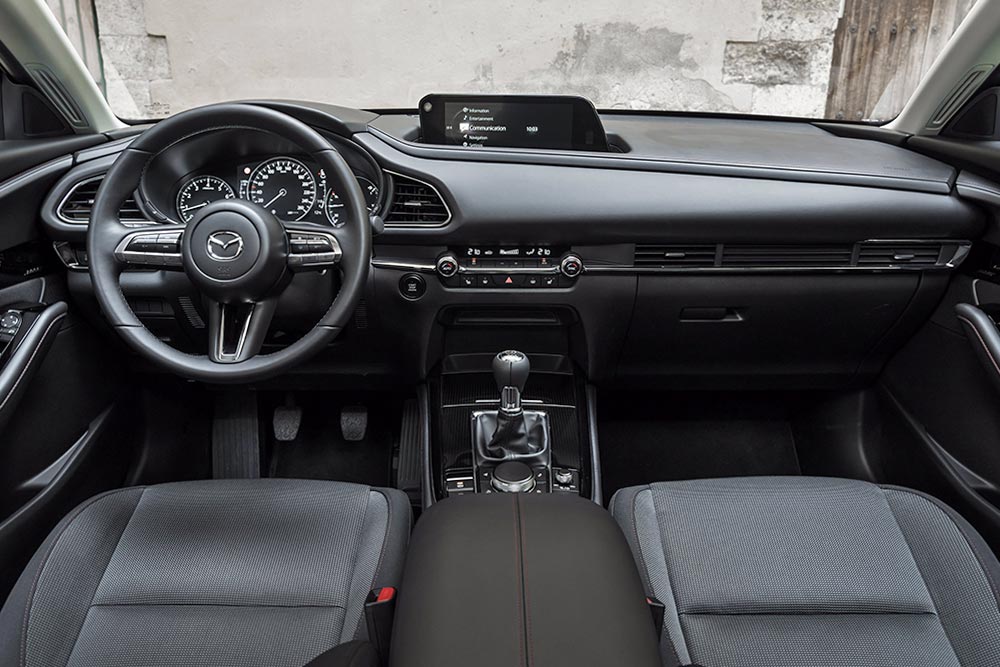 Το Mazda CX-30 με μήκος 4.395 χιλιοστά τοποθετείται στην κατηγορία των μικρομεσαίων SUV, αν και πολλοί ανταγωνιστές του έχουν μεγαλώσει και βρίσκονται στα 4,5 μ. και άνω. Στο ανανεωμένο CX-30 προστέθηκε το νέο χρώμα Platimum Quartz και η έκδοση εξοπλισμού Homura. Αυτή διαθέτει γυαλιστερές μαύρες ζάντες αλουμινίου, μαύρα καλύμματα στους πλευρικούς καθρέφτες και εσωτερική επένδυση σε μαύρο ύφασμα με κόκκινες λεπτομέρειες. Στοιχεία που διαθέτει το αυτοκίνητο που βλέπετε και πωλείται στην τιμή των 32.491 ευρώ. Εδώ να σημειώσουμε ότι υπάρχουν και τα πιο προσιτά CX-30 e-Skyactiv G 2.0 122 PS (από 28.378 ευρώ) και e-Skyactiv G 2.0 150 PS (από 31.253 ευρώ).