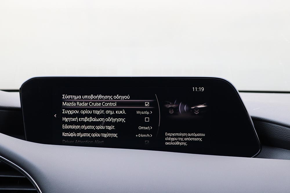 Η απλότητα στον σχεδιασμό του εσωτερικού, χωρίς τεράστιες οθόνες και ένα σωρό διαφορετικές επιφάνειες και υλικά, είναι κάτι που αντιλαμβάνεται άμεσα όποιος βρεθεί σε αυτό. Όσοι εστιάζουν στην ουσία και όχι στο «φαίνεσθαι», θα εκτιμήσουν αμέσως τη μινιμάλ φιλοσοφία της Mazda, μαζί με την πάρα πολύ καλή ποιότητα κατασκευής. Το μεγαλύτερο μέρος του ταμπλό και των εμπρός θυρών αποτελούνται από μαλακά στην αφή υλικά και συνδυαστικά με τις ραφές, την προσεγμένη συναρμογή και το εξαιρετικό φινίρισμα, συνθέτουν μια πολυτελή ατμόσφαιρα.