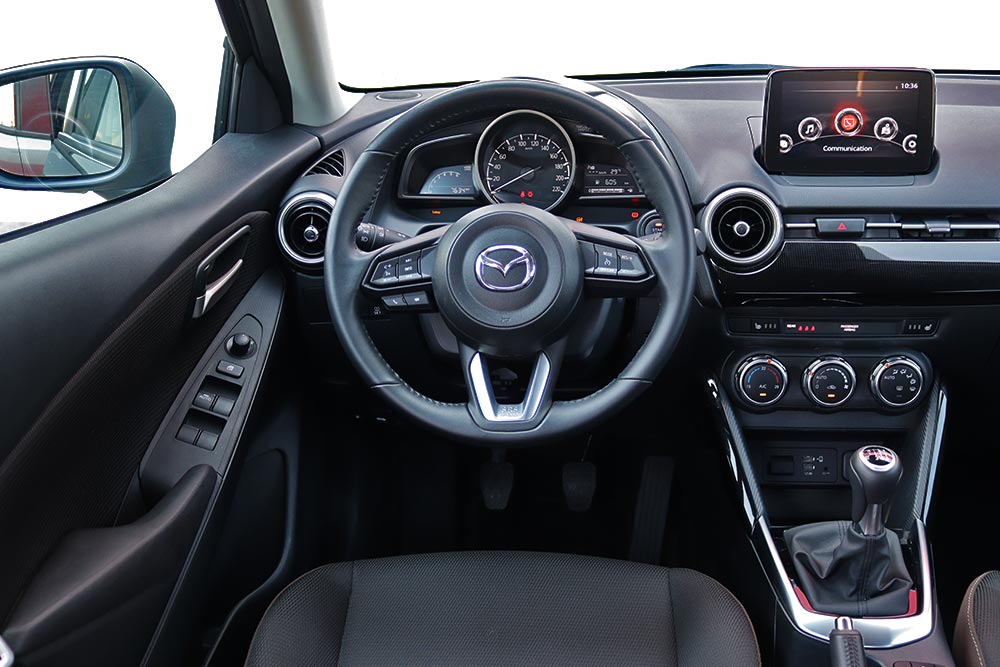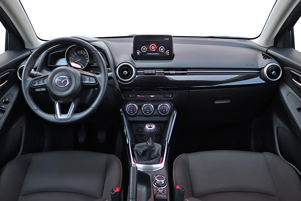 Ανέκαθεν η Mazda φρόντιζε να προσφέρει αυτοκίνητα με προσεγμένη καμπίνα. Το εσωτερικό του Mazda2 κινείται σε αυτή την πεπατημένη, όντας κατασκευασμένο από στιβαρά υλικά (αν και στην πλειοψηφία τους είναι σκληρά) και με σωστή συναρμογή, αφού ακόμα και σε κακοτράχαλο οδόστρωμα δεν ακούγονται τριγμοί. Θετικά σχόλια κερδίζει το σπορ τιμόνι, καθώς επίσης κι ο ευανάγνωστος πίνακας οργάνων, ενώ ικανοποιημένοι θα μείνετε κι από την οθόνη του infotainment, το οποίο είναι συμβατό με τα πρωτόκολλα επικοινωνίας Apple CarPlay και Android Auto. Οι εντολές στο σύστημα δίνονται από το χειριστήριο πίσω από το λεβιέ ταχυτήτων όταν είστε εν κινήσει, ενώ με το Mazda 2 σταματημένο η οθόνη των 7 ιντσών ανταποκρίνεται και στην αφή! Χωροταξικά τώρα, δεν έχουμε να κάνουμε και με το πλέον ευρύχωρο της κατηγορίας. Τέσσερις επιβάτες θα βολευτούν, αλλά αν οι πίσω είναι άνω του μέσου όρου σε ύψος, τότε θα ακούσετε παράπονα. Όπως και για το χώρο αποσκευών, μιας και τα 250 λτ. διαθέσιμου χώρου είναι λίγα.