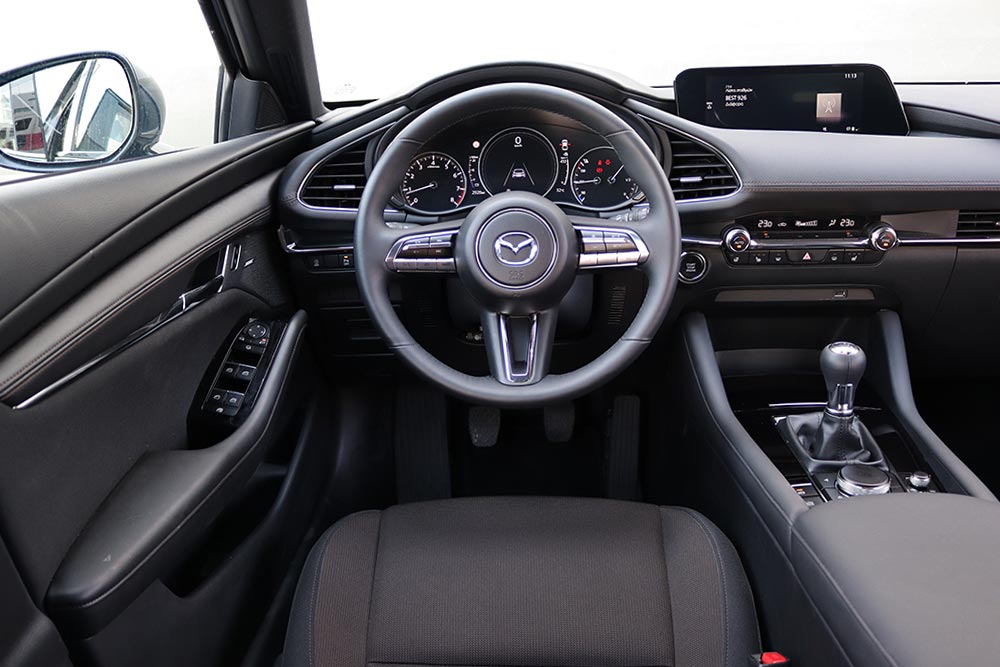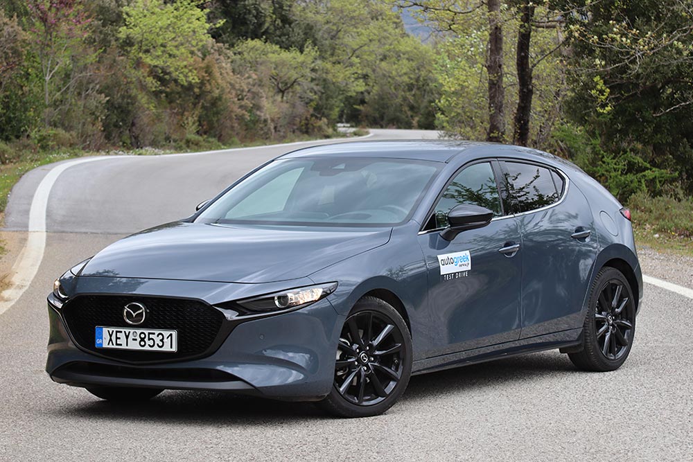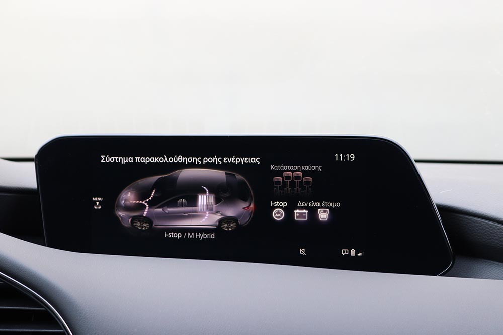 Το αυτοκίνητο της δοκιμής αφορά τη μεσαία έκδοση ισχύος, το e-Skyactiv G150. Από την πρώτη κιόλας έκδοση Plus ο εξοπλισμός που φέρει είναι υπερπλήρης με όλα τα συστήματα υποβοήθησης του οδηγού, ανέσεων και ασφαλείας. Στάνταρ είναι ακόμα το Head-Up Display, σύστημα πλοήγησης, 18άρες ζάντες, θερμαινόμενα εμπρός καθίσματα και θερμαινόμενο τιμόνι. Το μοντέλο που βλέπετε είναι η έκδοση Homura (από 29.038 ευρώ το G150), με επιπλέον μαύρες ζάντες και καθρέπτες, φιμέ τζάμια και το χρώμα Platinum Quartz.