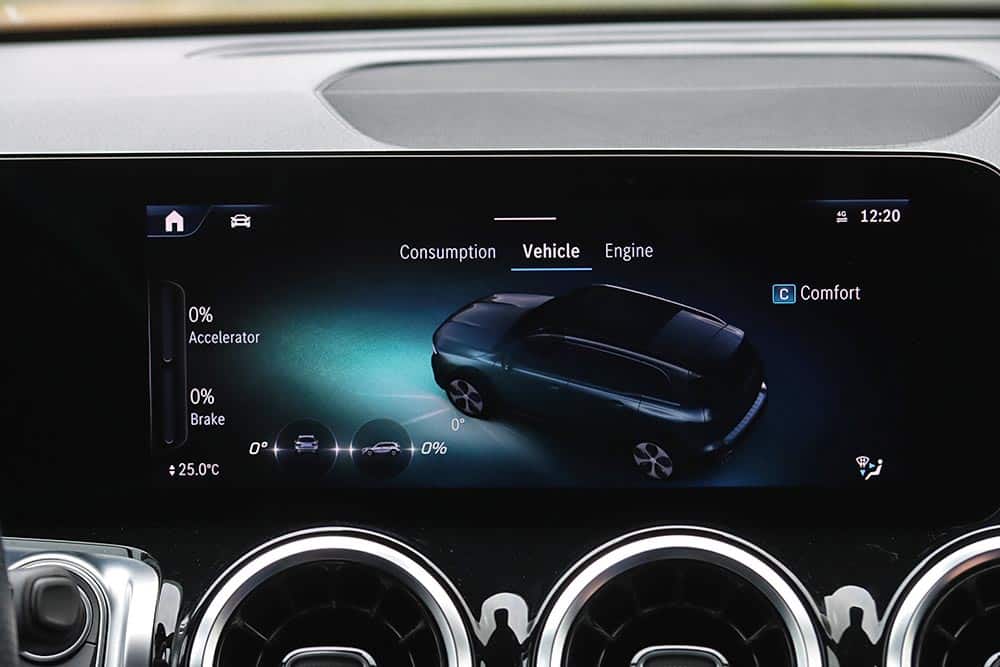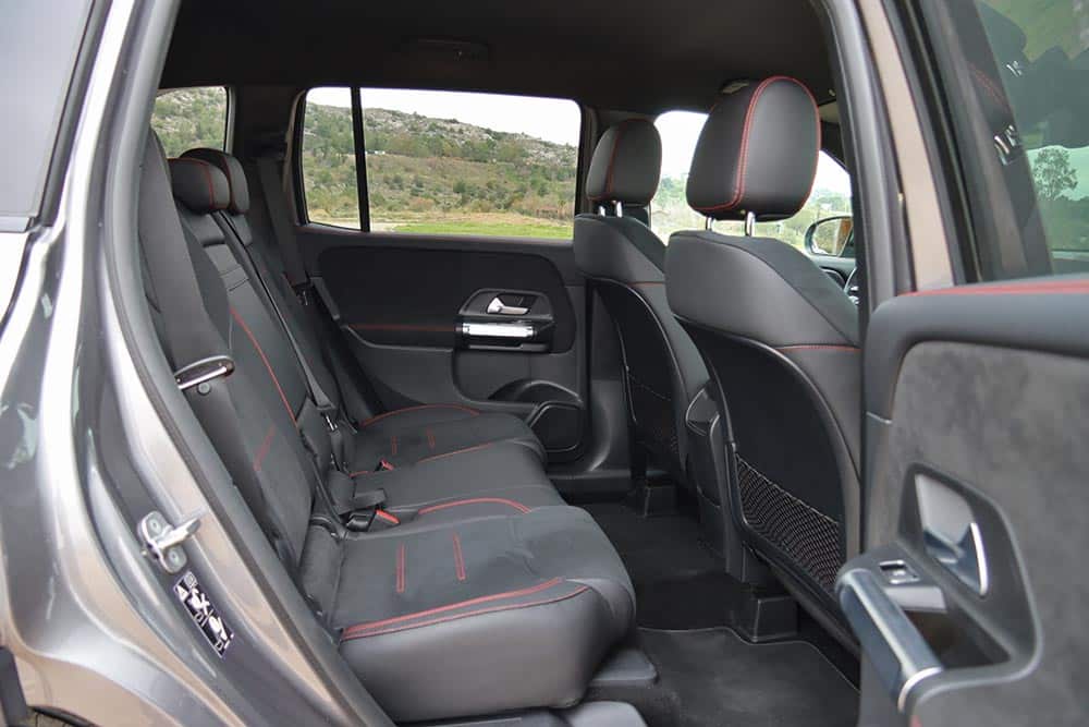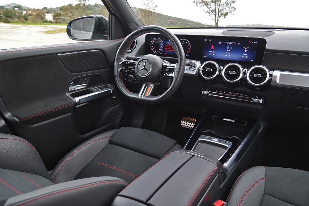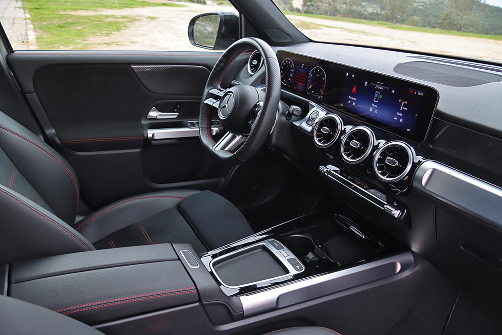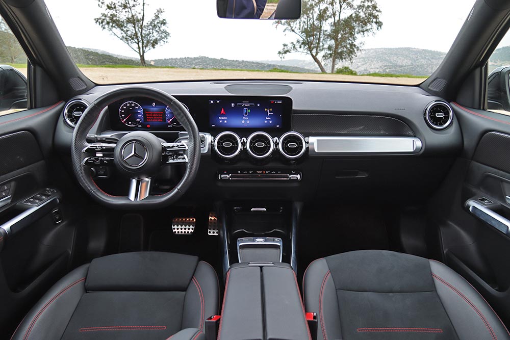 Η Mercedes-Benz GLB διαθέτει πληθωρικά χαρακτηριστικά και στο εσωτερικό της, όπου ο σχεδιασμός είναι παρόμοιος με εκείνων των άλλων μικρομεσαίων μοντέλων της μάρκας, όπως είναι η A-Class και η GLA. Ξεχωριστό στοιχείο που διαφοροποιεί την GLB και ενισχύει τον πιο off road χαρακτήρα της, είναι η διακοσμητική λαβή στο ταμπλό από την πλευρά του συνοδηγού. Αντίστοιχες επενδύσεις με όψη αλουμινίου συναντώνται μπροστά από τον οδηγό και στις πόρτες, όπως και στους στρογγυλούς αεραγωγούς. Η ανανεωμένη GLB είναι εξοπλισμένη με την τελευταία γενιά του MBUX, ενώ το δύσχρηστο – touchpad για την περιήγηση στο μενού που υπήρχε πριν αφαιρέθηκε και στη θέση του μπήκε μια ρηχή θήκη. Στην κεντρική κονσόλα υπάρχουν πολλές ακόμα θήκες, όπως κάτω από το εμπρός υποβραχιόνιο. Όλες οι λειτουργίες εξακολουθούν να είναι διαθέσιμες και ο χειρισμός τους μπορεί να πραγματοποιείται είτε από την οθόνη αφής που δεν είναι τόσο κοντά από τον οδηγό, ή από τα (όχι τόσο πρακτικά) χειριστήρια αφής στο τιμόνι. Σίγουρα πιο εύκολο στη χρήση ήταν το περιστροφικό χειριστήριο στην κονσόλα που υπήρχε στις παλαιότερες Mercedes. Οι δύο οθόνες που ενσωματώνονται σε ένα ενιαίο πάνελ είναι πολύ καλής ευκρίνειας και με διαφορετικά στιλ (Classic, Sporty, Discreet, Navigation, Assistance και Service) για τον πίνακα οργάνων. Για περαιτέρω συνδεσιμότητα, η GLB διαθέτει πλέον μία πρόσθετη θύρα USB-C και αυξημένη ισχύ φόρτισης USB, ενώ όλες οι θύρες USB είναι φωτιζόμενες. Επίσης, έξυπνη φωνητική υποβοήθηση της Mercedes-Benz αποκτά όλο και περισσότερες δυνατότητες διαλόγου και εκμάθησης χάρη σε online υπηρεσίες που μπορούν να ενεργοποιηθούν από την εφαρμογή Mercedes me.