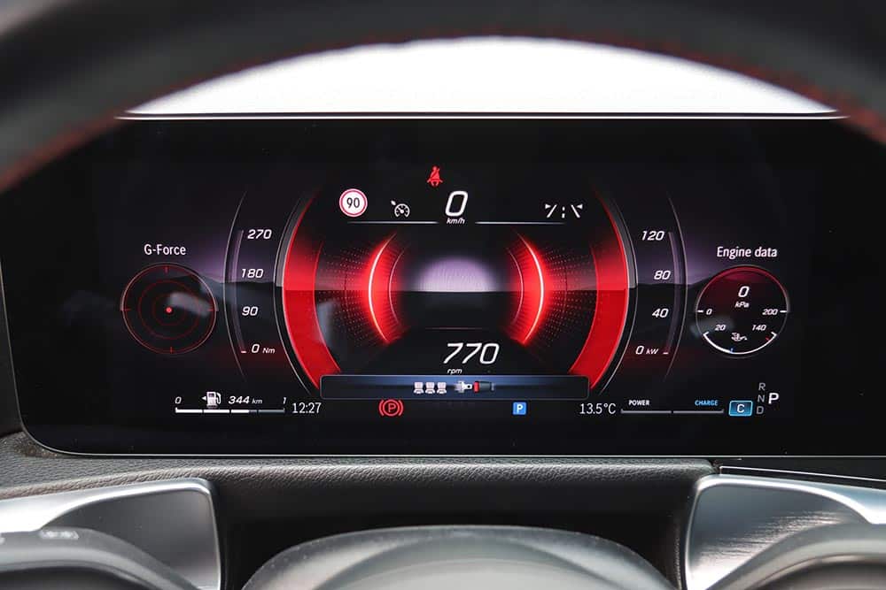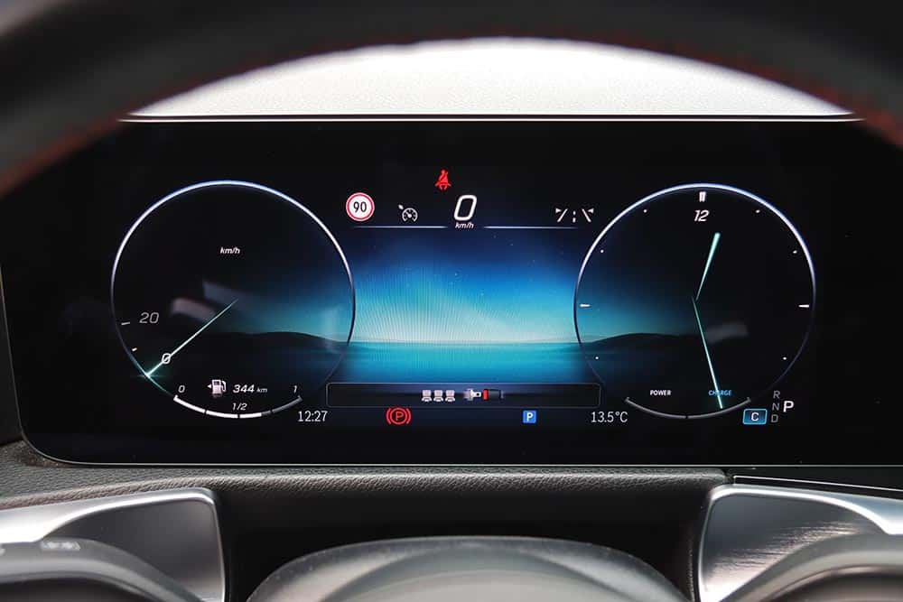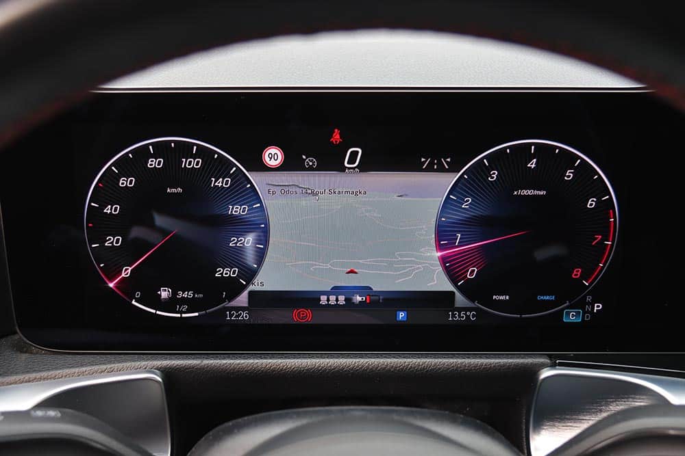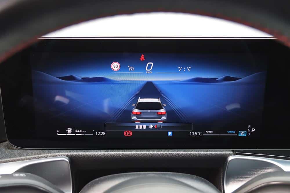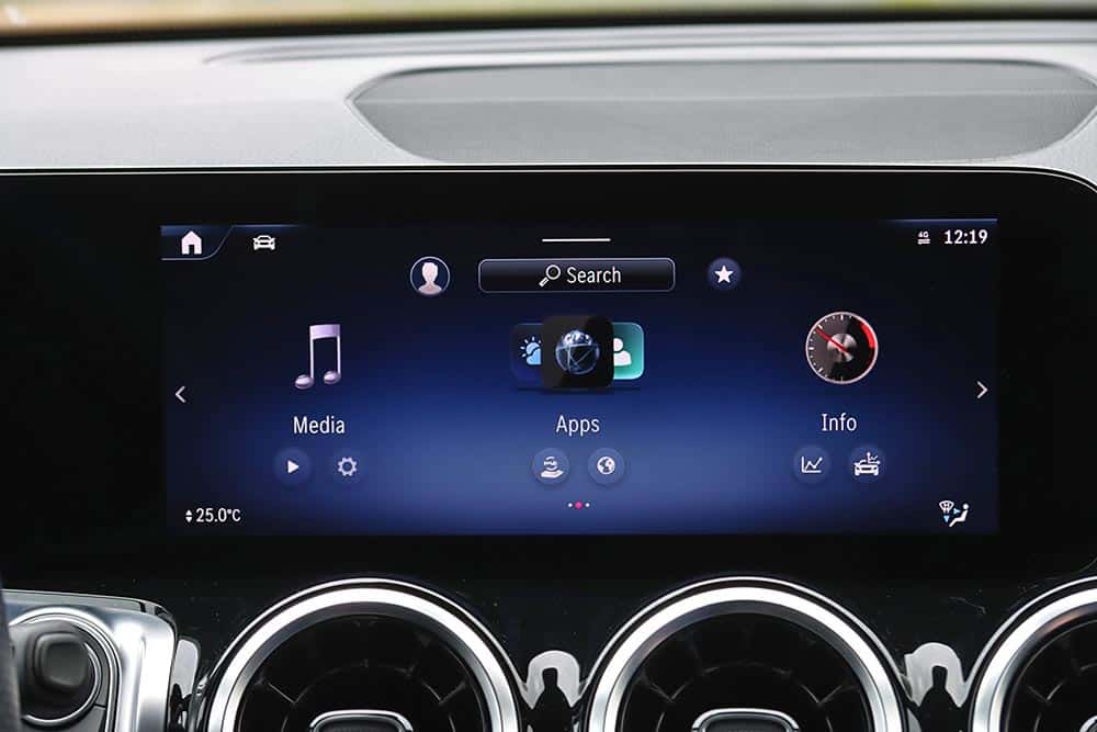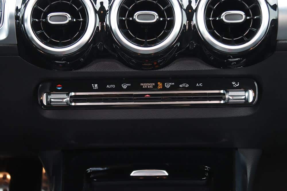 Η Mercedes-Benz GLB διαθέτει πληθωρικά χαρακτηριστικά και στο εσωτερικό της, όπου ο σχεδιασμός είναι παρόμοιος με εκείνων των άλλων μικρομεσαίων μοντέλων της μάρκας, όπως είναι η A-Class και η GLA. Ξεχωριστό στοιχείο που διαφοροποιεί την GLB και ενισχύει τον πιο off road χαρακτήρα της, είναι η διακοσμητική λαβή στο ταμπλό από την πλευρά του συνοδηγού. Αντίστοιχες επενδύσεις με όψη αλουμινίου συναντώνται μπροστά από τον οδηγό και στις πόρτες, όπως και στους στρογγυλούς αεραγωγούς. Η ανανεωμένη GLB είναι εξοπλισμένη με την τελευταία γενιά του MBUX, ενώ το δύσχρηστο – touchpad για την περιήγηση στο μενού που υπήρχε πριν αφαιρέθηκε και στη θέση του μπήκε μια ρηχή θήκη. Στην κεντρική κονσόλα υπάρχουν πολλές ακόμα θήκες, όπως κάτω από το εμπρός υποβραχιόνιο. Όλες οι λειτουργίες εξακολουθούν να είναι διαθέσιμες και ο χειρισμός τους μπορεί να πραγματοποιείται είτε από την οθόνη αφής που δεν είναι τόσο κοντά από τον οδηγό, ή από τα (όχι τόσο πρακτικά) χειριστήρια αφής στο τιμόνι. Σίγουρα πιο εύκολο στη χρήση ήταν το περιστροφικό χειριστήριο στην κονσόλα που υπήρχε στις παλαιότερες Mercedes. Οι δύο οθόνες που ενσωματώνονται σε ένα ενιαίο πάνελ είναι πολύ καλής ευκρίνειας και με διαφορετικά στιλ (Classic, Sporty, Discreet, Navigation, Assistance και Service) για τον πίνακα οργάνων. Για περαιτέρω συνδεσιμότητα, η GLB διαθέτει πλέον μία πρόσθετη θύρα USB-C και αυξημένη ισχύ φόρτισης USB, ενώ όλες οι θύρες USB είναι φωτιζόμενες. Επίσης, έξυπνη φωνητική υποβοήθηση της Mercedes-Benz αποκτά όλο και περισσότερες δυνατότητες διαλόγου και εκμάθησης χάρη σε online υπηρεσίες που μπορούν να ενεργοποιηθούν από την εφαρμογή Mercedes me.