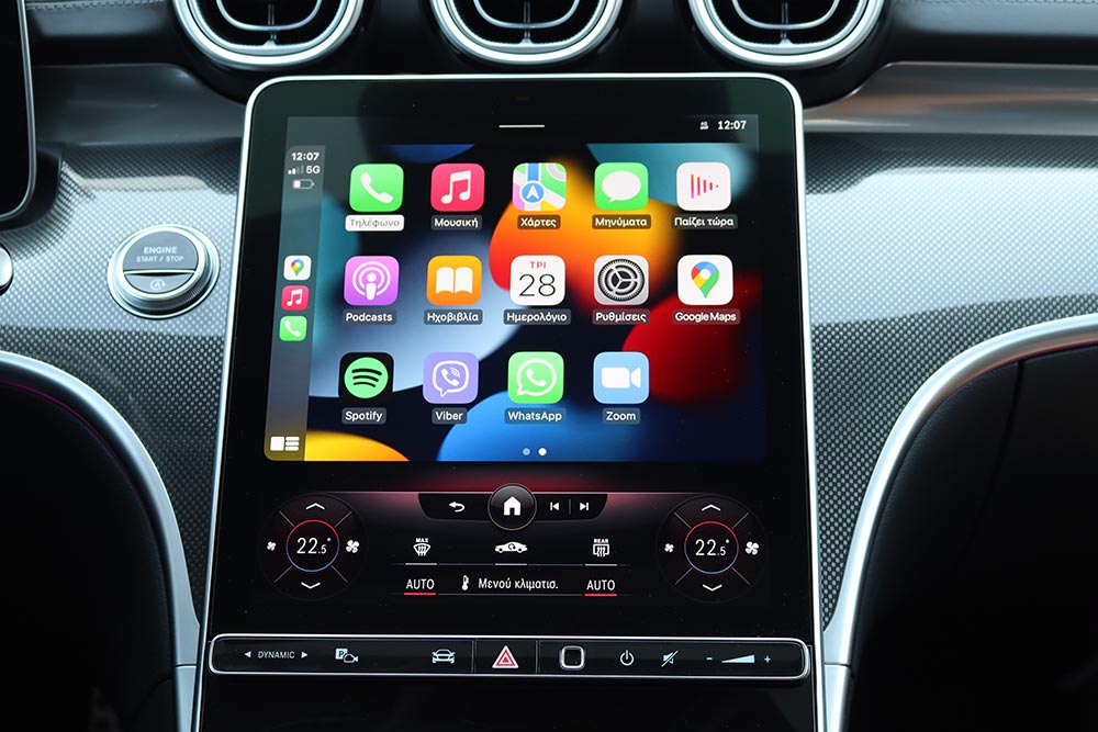 Αναμφίβολα οι σχεδιαστές της Mercedes δαπάνησαν πάρα πολλές ώρες για να δημιουργήσουν την καμπίνα της νέας C-Class και αυτό που μπορούμε να πούμε με σιγουριά, είναι πως ο χρόνος αυτός έπιασε τόπο. Ερχόμενοι σε επαφή με το εσωτερικό της C 200 πραγματικά ενθουσιαστήκαμε. Φέρνοντας στο μυαλό μας τον άμεσο ανταγωνισμό της, χωρίς ενδοιασμό είπαμε ότι πραγματικά η νέα Mercedes τον αφήνει πίσω της. Αρχικά η τεχνολογία είναι έντονη και διάσπαρτη, με κυρίαρχο στοιχείο την κάθετη και επικλινής οθόνη 11,9 ιντσών στην κεντρική κονσόλα, όπου μέσω αυτής ελέγχονται οι άπειρες δυνατότητες του συστήματος MBUX. Ακόμα μια οθόνη έχει ο οδηγός στη διάθεσή του και αφορά τον ψηφιακό πίνακα οργάνων των 12,3 ιντσών, ο οποίος είναι παραμετροποιήσιμος ανάλογα με το προφίλ που θα επιλέξει. Όμως η ουσία κρύβεται πίσω από τις ίντσες των οθονών, αφού το νέας γενιάς σύστημα MBUX είναι ακόμα πιο εξελιγμένο, υπακούοντας σε φωνητικές εντολές, αναγνωρίζοντας μάλιστα τους επιβάτες από τις φωνές τους. Κι αν δεν θέλετε να «φορτώσετε» το αγαπημένο σας προφίλ με τη φωνή σας, μπορείτε να το κάνετε μέσω δαχτυλικού αποτυπώματος, με τον αισθητήρα που υπάρχει κάτω από τη μεγάλη οθόνη. Το πλέον εκπληκτικό είναι πως παρά την τόση τεχνολογία, ο οδηγός θα εξοικειωθεί γρήγορα και θα χειριστεί με ευκολία όλες τις παραμέτρους των συστημάτων της Mercedes C-Class.