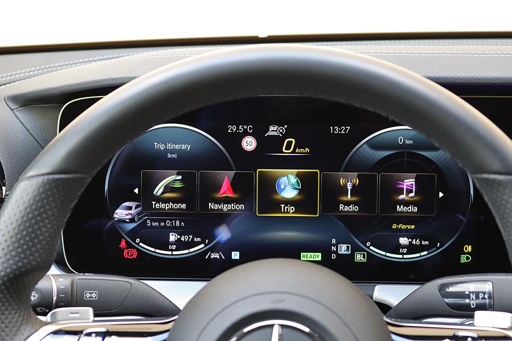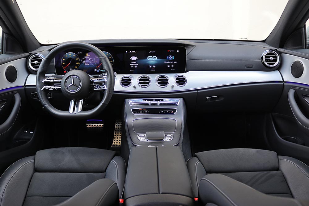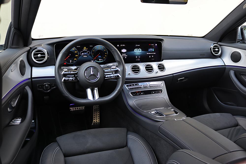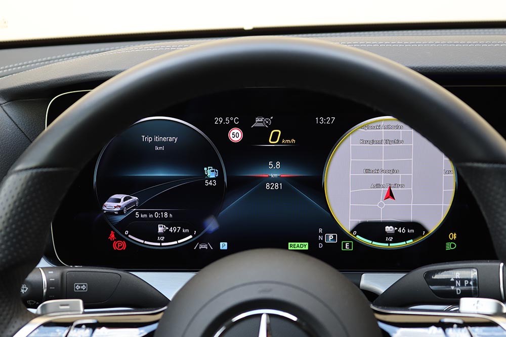Το έχετε εμπεδώσει κι εσείς για τα καλά μέσα από τις δοκιμές μας, πως όλα τα σύγχρονα αυτοκίνητα διαθέτουν εσωτερικά, που ξεχωρίζουν με την προηγμένη τεχνολογία που ενσωματώνουν. Σαφώς και μια E-Class δεν θα μπορούσε να προσφέρει τίποτε λιγότερο σε αυτόν τον τομέα! Αρχικά θα σας κυριεύσουν οι ψηφιακές οθόνες του πίνακα οργάνων και του infotainment, η διάσταση των οποίων αγγίζει τις έως και 12,3 ίντσες (10,25 στο βασικό εξοπλισμό). Αυτές ενώνονται μεταξύ τους, απογειώνοντας τη ψηφιακή εμπειρία που προσφέρει η E 300 e. Χάρη στο εξελιγμένο λογισμικό, ο οδηγός μπορεί να διαμορφώσει ανάλογα το τι πληροφορία θα καταλήγει στα μάτια του, μέσα από τέσσερα διαφορετικά προφίλ. Το πρώτο είναι το Κλασικό που απεικονίζει τα βασικά στοιχεία για έναν πίνακα οργάνων και ακολουθεί το Σπορ, που όπως δηλώνει και το όνομα του, δίνει έμφαση στη δυναμική οδήγηση. Το Προοδευτικό με τη σειρά του τονίζει τα ψηφιακά χαρακτηριστικά του αυτοκινήτου, ενώ το Διακριτικό, μειώνει τις πληροφορίες και τα στοιχεία που απεικονίζονται μόνο στα απολύτως απαραίτητα. Εξαιρετικά σχόλια αποσπά και το νέο τιμόνι με το διπλό μπράτσο, πάνω στο οποίο βρίσκονται τα χειριστήρια αφής που αφορούν διάφορες λειτουργίες του αυτοκινήτου. Οι χώροι επιβατών είναι εξαιρετικοί, όμως στο πορτ μπαγκάζ έχουμε μια παραφωνία λόγω των μπαταριών, που μειώνουν σημαντικά τη χωρητικότητά του στα 370 λτ. (από 540 λτ.). Επιπρόσθετα, έτσι όπως έχουν τοποθετηθεί, δημιουργείται ένα έντονο σκαλοπάτι , το οποίο πέρα από τη μείωση του όγκου δεν επιτρέπει την άρτια εκμετάλλευση του χώρου.