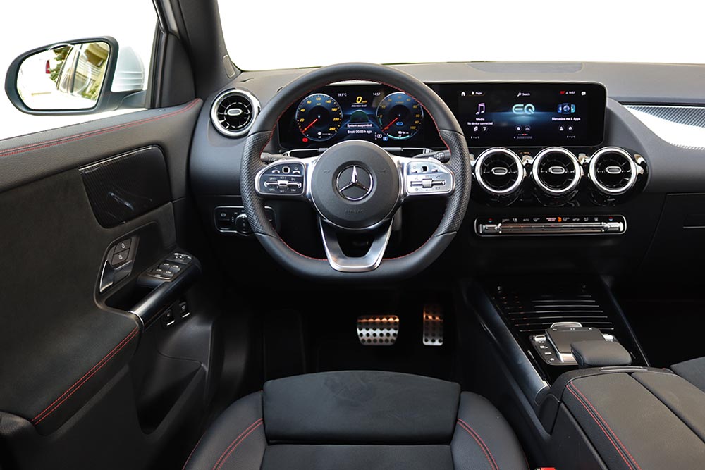 Το εσωτερικό, της GLA 250 e δεν έχει διαφορές συγκριτικά με τις υπόλοιπες εκδόσεις του μοντέλου. Αυτό σημαίνει πως οδηγός κι επιβάτες απολαμβάνουν ευρυχωρία, σπορτίφ σχεδίαση και υλικά κορυφαίας ποιότητας! Και εδώ την παράσταση κλέβει η ενιαία τεχνοτροπία Widescreen, η οποία συνδυάζει δυο οθόνες 10,25 ιντσών (στάνταρ είναι 7 ιντσών), μία για τον πίνακα οργάνων και μία του συστήματος πολυμέσων. Η πληροφόρηση που λαμβάνει ο χειριστής είναι πλούσια, ενώ στην περίπτωσή μας προσφέρει επιπλέον ενημέρωση για το επίπεδο φόρτισης της μπαταρίας, της ροής ενέργειας, αλλά και γενικότερα για τα του ηλεκτροκινητήρα.