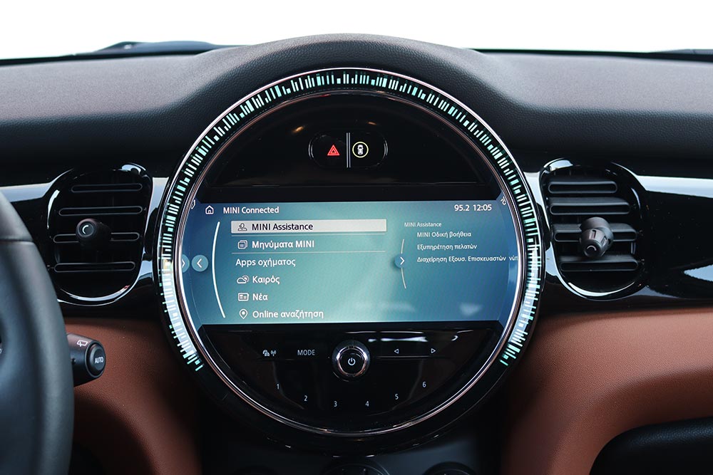 Γνώριμο είναι και το περιβάλλον στο εσωτερικό του ΜΙΝΙ με την υψηλή ποιότητα κατασκευής και το εντυπωσιακό ντιζάιν του. Το νέας σχεδίασης κεντρικό όργανο που ενσωματώνει την οθόνη αφής των 8,8 ιντσών εξακολουθεί να τραβάει την προσοχή στο ανώτερο σημείο της κεντρικής κονσόλας, προσδίδοντας το απαραίτητο πρεστίζ που αναζητά ο κάτοχος ενός ΜΙΝΙ. Στο σύνολό του το ταμπλό αποτελείται από μαλακά υλικά και με πολύ καλή συναρμογή μεταξύ τους, ενώ οι διακόπτες αεροπορικού τύπου εξακολουθούν να εντυπωσιάζουν. Ο οδηγός κάθεται καλά στο όμορφο και ρυθμιζόμενο κάθισμά του. Ανάλογα με την εξοπλιστική έκδοση, μπορεί να λαμβάνει την απαραίτητη πληροφόρηση από τον ψηφιακό πίνακα οργάνων των 5 ιντσών (ανήκει στον προαιρετικό εξοπλισμό), ενώ σίγουρα θα ενθουσιαστεί από το «χορταστικό» τιμόνι με την παχιά στεφάνη και την υπέροχη υφή.