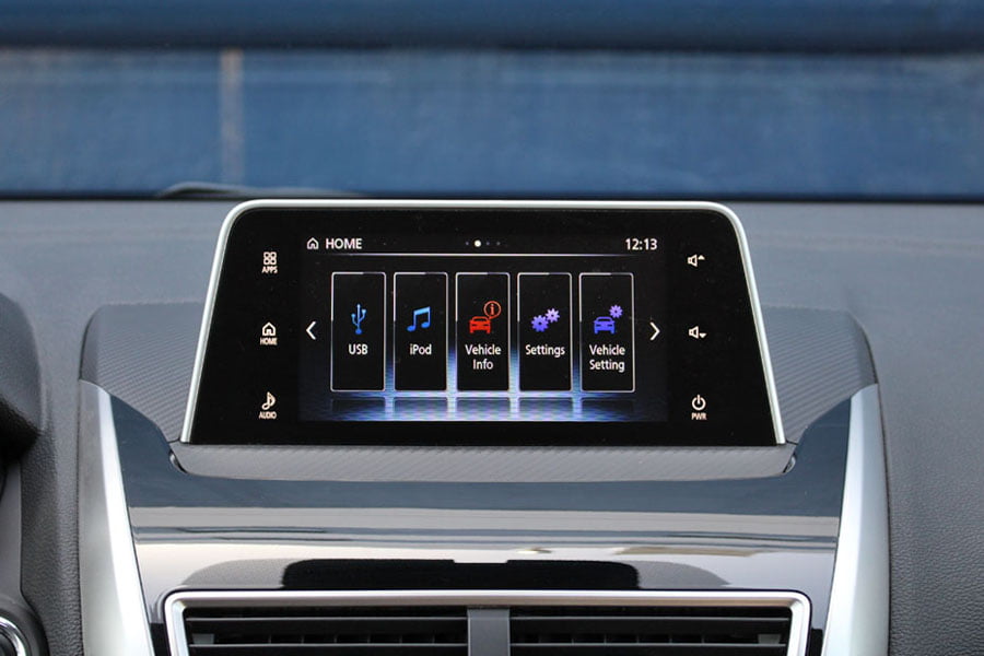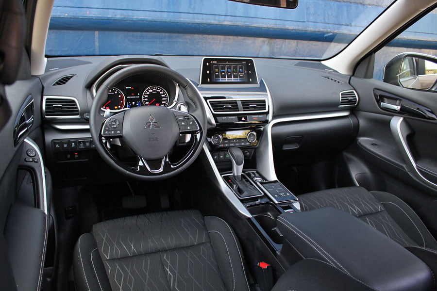 Στον θάλαμο των επιβατών του Eclipse Cross η σχεδίαση είναι πιο ήπιων τόνων και διακρίνεται για τη νέα αρχιτεκτονική του ταμπλό με κύριο στοιχείο τον οριζόντιο άξονα και τις απαλές καμπύλες επιφάνειες. Η κατασκευή του είναι αρκετά προσεγμένη τόσο σε υλικά μέσω της χρήσης μαλακών πλαστικών σε ολόκληρο το ταμπλό και στο πάνω μέρος των θυρών, όσο και σε συναρμογή και φινίρισμα. Την high-tech εικόνα του εσωτερικού ενισχύει το Touchpad Controller που βρίσκεται δίπλα από τον επιλογέα των ταχυτήτων και ελέγχεται σχετικά εύκολα μέσω των δακτύλων για διάφορες λειτουργίες του συστήματος πολυμέσων. Το Smartphone Link Display Audio (SDA) με την λεπτή οθόνη αφής των 7 ιντσών βρίσκεται ψηλά στο ταμπλό και ενσωματώνει πολλές λειτουργίες του αυτοκινήτου. Ένα ακόμα τεχνολογικό στοιχείο του Eclipse Cross αποτελεί και το Head Up Display πάνω από τον πίνακα οργάνων, το οποίο μέσω μιας αναδιπλούμενης έγχρωμης κρυστάλλινης οθόνης προβάλλει την ταχύτητα, την πλοήγηση, στα συστήματα υποβοήθησης του οδηγού κ.λπ.