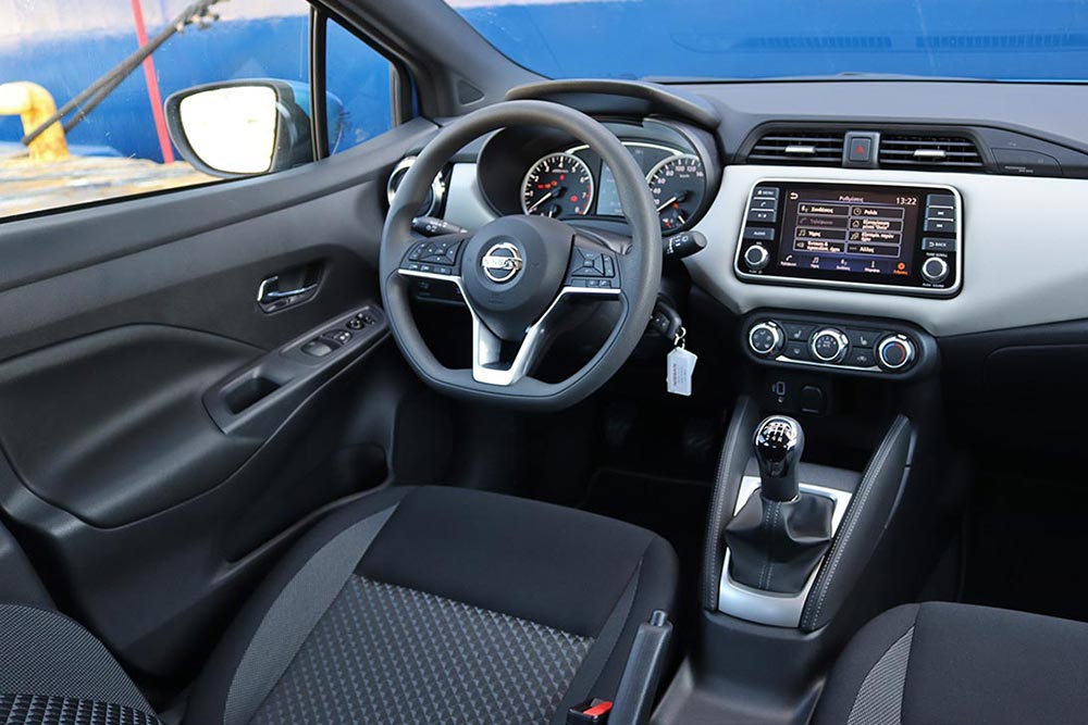 Διαφορές με το προηγούμενο μοντέλο δεν θα συναντήσετε στην καμπίνα του Micra, η οποία ξεχωρίζει με τον μοντέρνο σχεδιασμό της, τον ευχάριστο διάκοσμο και την προσεγμένη ποιότητα. Αυτή ενισχύεται από το παχύ αφρώδες υλικό που καλύπτει ολόκληρο το πάνω μέρος του ταμπλό. Πολύ καλές εντυπώσεις μας άφησε και το σύστημα πολυμέσων NissanConnect με δυνατότητα σύνδεσης με Apple CarPlay & Android Auto, με το λογισμικό των χαρτών να αναβαθμίζεται με τη μέθοδο Over The Air (ΟΤΑ). Εμάς μας άρεσε το εξαιρετικά βολικό σύστημα Door to Door Navigation που σας επιτρέπει να χαράξετε τη διαδρομή σας από το κινητό σας και μόλις μπείτε στο Micra οι διαδρομές σας να απεικονίζονται στο infotainment. Καλοί είναι κι οι χώροι επιβατών και μόνο οι αρκετά ψηλοί θα ζοριστούν ελαφρώς στο πίσω κάθισμα. Το πορτμπαγκάζ έχει χωρητικότητα 300 λίτρα κι είναι από τα μεγαλύτερα της κατηγορίας, ενώ διαθέτει και πλήρως εκμεταλλεύσιμο σχήμα.