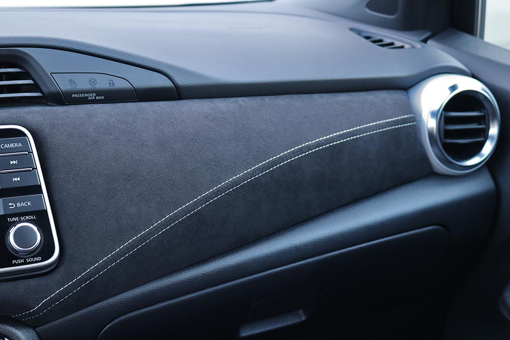 Ανεξαρτήτου εξωτερικού χρωματισμού, η εικόνα στο εσωτερικό του N-Sport δεν αφήνει περιθώρια μπερδέματος. Η alcantara που ντύνει την μπροστινήφάσα του ταμπλό μονοπωλεί τις εντυπώσεις, ανεβάζοντας αυτομάτως πολλαπλά επίπεδα το διάκοσμο του Micra. Ο συνδυασμός δέρματος-alcantara στα μπάκετ καθίσματα συνεχίζει την αναβάθμιση, με τις λευκές ραφές και τις ρίγες να δένουν υπέροχα με τις επενδύσεις.