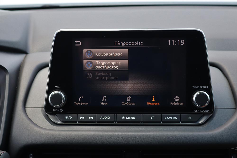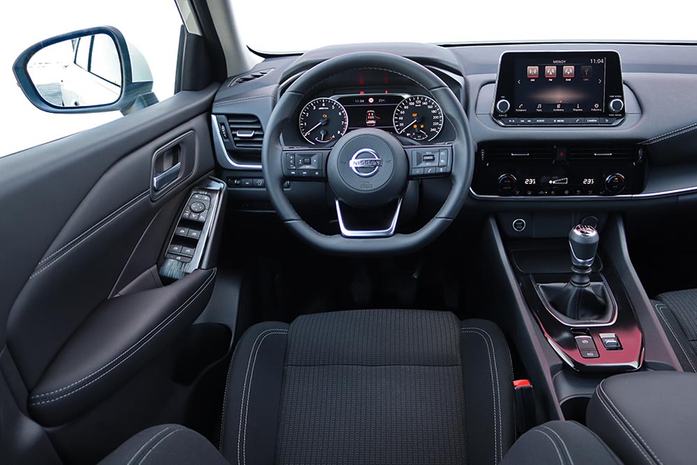 Οι εμπρός επιβάτες ακουμπούν σε μαλακές επιφάνειες, και σε συνδυασμό με τα αναπαυτικά καθίσματα «μηδενικής βαρύτητας» εμπνευσμένα από τη NASA, η διαμονή τους στην καμπίνα είναι πιο ευχάριστη και ξεκούραστη. Παράλληλα, ο οδηγός βολεύεται γρήγορα στη θέση του και θα εξοικειωθεί εύκολα με τις θέσεις και λειτουργίες των διαφόρων χειριστηρίων, μαζί με το απλό μενού της κεντρικής οθόνης των 8 ιντσών (βασική έκδοση TFT 7 ιντσών και πιο πλούσιες 9 ιντσών του NissanConnect). Επιπλέον παρέχεται Head-Up Display 10,8 ιντσών και πίνακας οργάνων πολλαπλών πληροφοριών με πλήρως ηλεκτρονική οθόνη TFT 12,3 ιντσών.