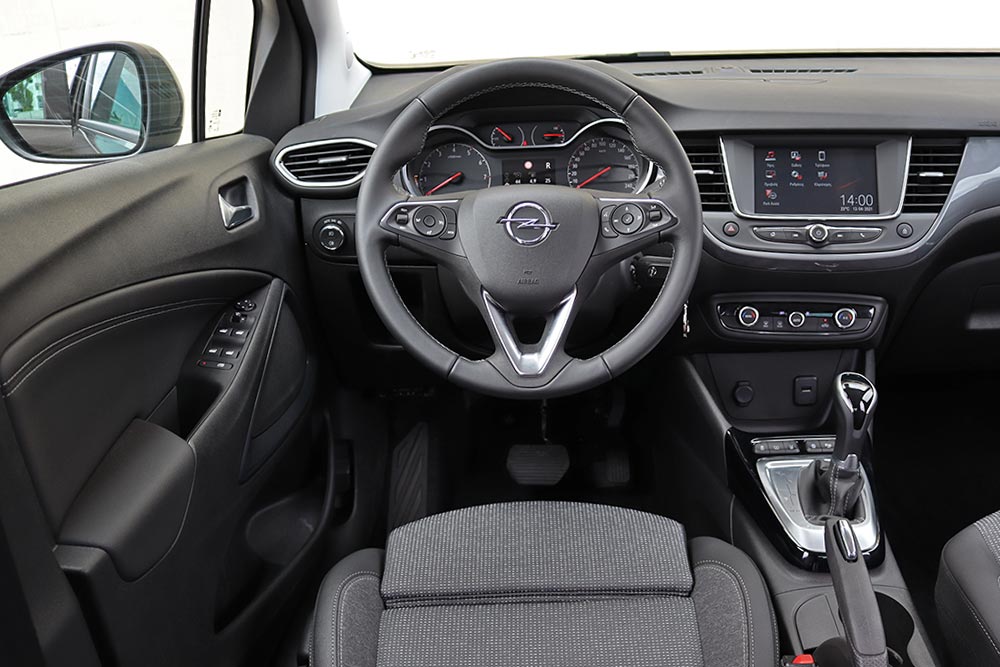 Η κομψότητα κυριαρχεί και στο εσωτερικό του Opel Crossland, όπου οδηγός και οι επιβάτες νιώθουν αμέσως βολικά και ευχάριστα. Στο ανώτερο σημείο της κεντρικής κονσόλας είναι ενσωματωμένη η εύκολη στο χειρισμό και με αρκετά καλή ευκρίνεια οθόνη των 7 ιντσών (προαιρετικά 8 ιντσών) του συστήματος infotainment. Ούτε προεξέχει από το ταμπλό, ούτε δείχνει παράταιρη με το όλο σύνολο. Το ίδιο ισχύει και τα απαραίτητα φυσικά χειριστήρια κάτω από την οθόνη και για τον έλεγχο του κλιματισμού στο κατώτερο τμήμα. Πλήρης είναι και ο πίνακας οργάνων με τις αναλογικές στρογγυλές ενδείξεις και το trip computer στο κέντρο. Θετικές κριτικές αποσπά το εσωτερικό του Opel Crossland και από πλευράς ποιότητας. Ένα μεγάλο μέρος του ταμπλό αποτελείται από μαλακό υλικό, τα υπόλοιπα επιμέρους σκληρά πλαστικά είναι συμπαγή και όλα συνολικά τα τμήματά του είναι πολύ καλά συναρμολογημένα μεταξύ τους.