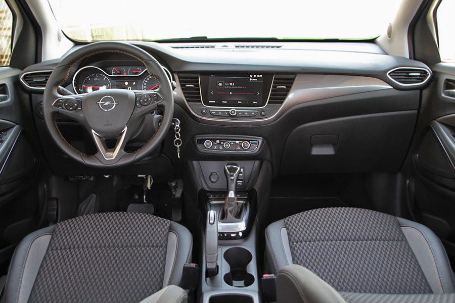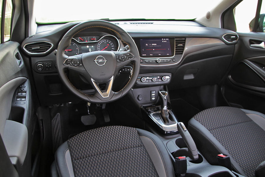 Στο εσωτερικό του Crossland X 1.5d 120 PS, η μόνη διαφορά σε σχέση με τις υπόλοιπες εκδόσεις εντοπίζεται στον επιλογέα του αυτόματου κιβωτίου. Ο λεβιές είναι εύκολος στο χειρισμό, ωστόσο αυτό που ενδέχεται να ενοχλήσει είναι η αντανάκλαση του ήλιου, όταν οι ακτίνες του πέφτουν πάνω στη φαρδιά νίκελ επένδυση της βάσης. Η σχεδίαση του ταμπλό είναι κομψή, ενώ τα χειριστήρια είναι λίγα, αφού οι περισσότερες λειτουργίες είναι ενσωματωμένες στην 8 ιντσών οθόνη (7 ιντσών η βασική) του Navi 5.0 IntelliLink, η οποία είναι εύχρηστη και δεν απαιτεί σχεδόν καθόλου εξοικείωση. Ο πίνακας οργάνων είναι ευανάγνωστος και με σύγχρονη εμφάνιση, δίχως να προκαλεί σύγχυση στον οδηγό. Από ποιοτικής άποψης το εσωτερικό του Crossland X αφήνει καλές εντυπώσεις με το μαλακό πλαστικό στο πάνω μέρος του ταμπλό, τα καλής υφής σκληρά υπόλοιπα πλαστικά και την προσεγμένη συναρμογή, αλλά και το φινίρισμα.